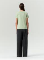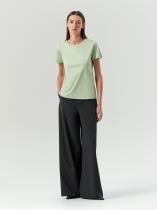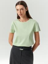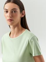 Базовая трикотажная футболка светло-зелёного оттенка. Модель прямого силуэта выполнена из плотного непросвечивающего хлопка. Универсальная длина позволяет носить изделие как навыпуск, так и в заправленном виде. Однотонная футболка будет незаменимой базовой вещью в любом гардеробе.