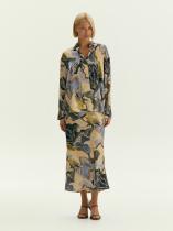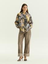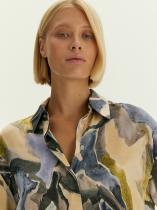 принтом в актуальных оттенках сезона: принт напоминает аметист, желтый и зелёный мрамор. Рубашка сделана из шелковистой вискозы, приятна к телу и удобна в стилизациях. За счёт принта с обилием сочетающихся оттенков вещь можно комбинировать с низом и верхом фиолетового, жёлтого, зелёного, серого, молочного цветов. Завершить образ можно юбкой из комплекта или базовым костюмным низом.