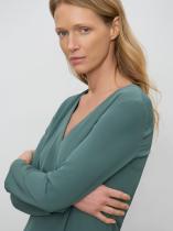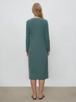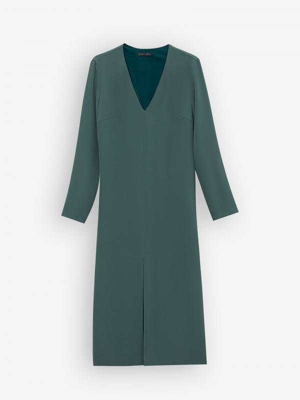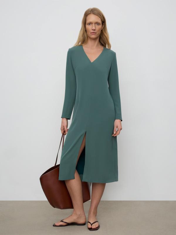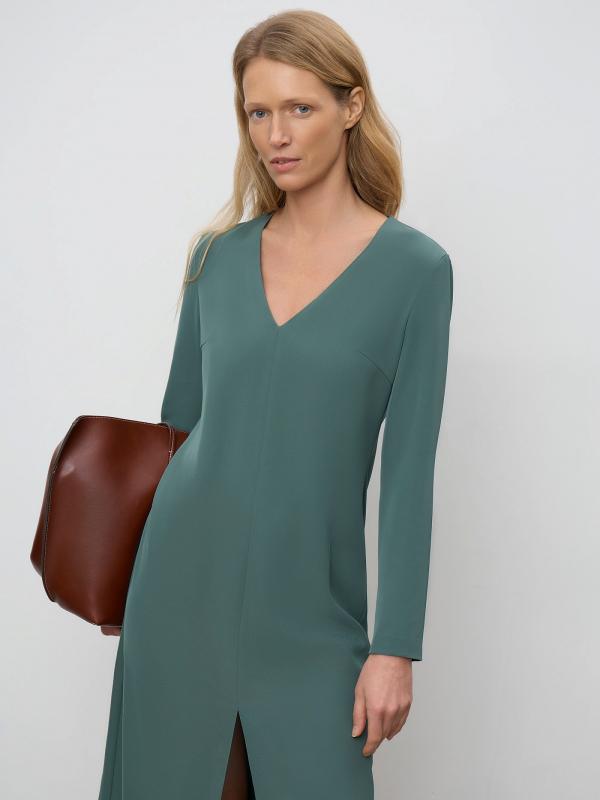 Базовое платье в глубоком оттенке зелёного. Модель миди прямого кроя с V-образным вырезом и длинным рукавом отличает разрез спереди. Платье станет основой повседневного гардероба, а с акцентными аксессуарами легко превратится в безупречный вариант для особого случая. Изделие застёгивается сзади на молнию. Выполнено из материала с содержанием вискозы, на подкладке.