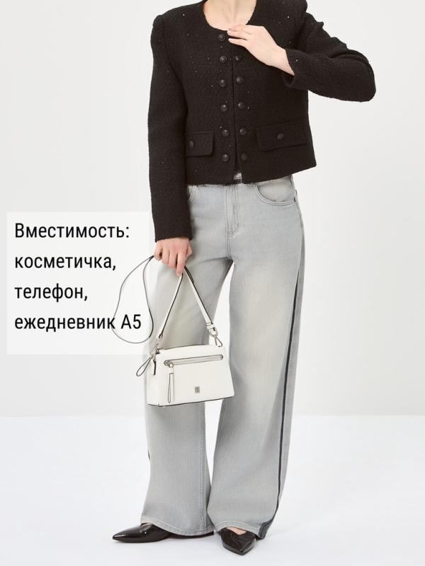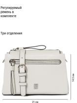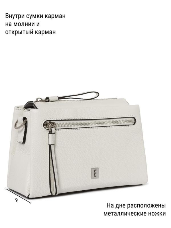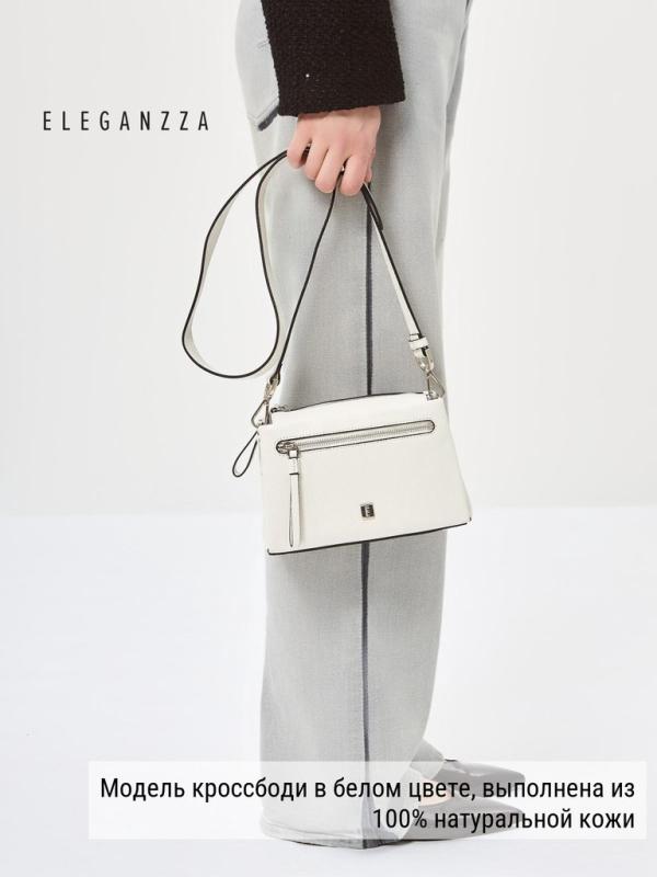 Женская сумка торговой марки Eleganzza из натуральной кожи. Модель закрывается на металлическую молнию. Внутри три отделения. Центральное отделение содержит внутри карман на молнии и открытый карман. На передней стенке - карман на молнии. Длина наплечного съёмного ремня из натуральной кожи - 110 см., ширина - 1,8 см. Модель имеет ножки на дне.