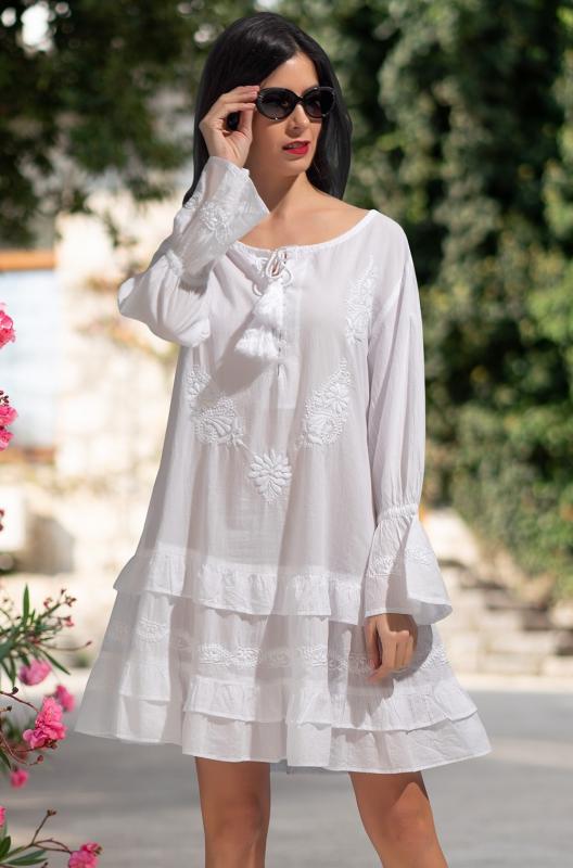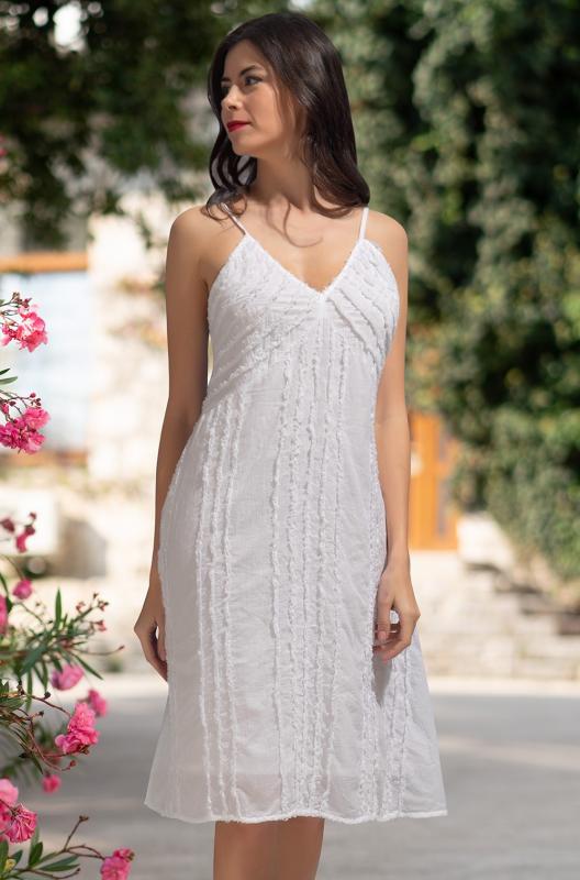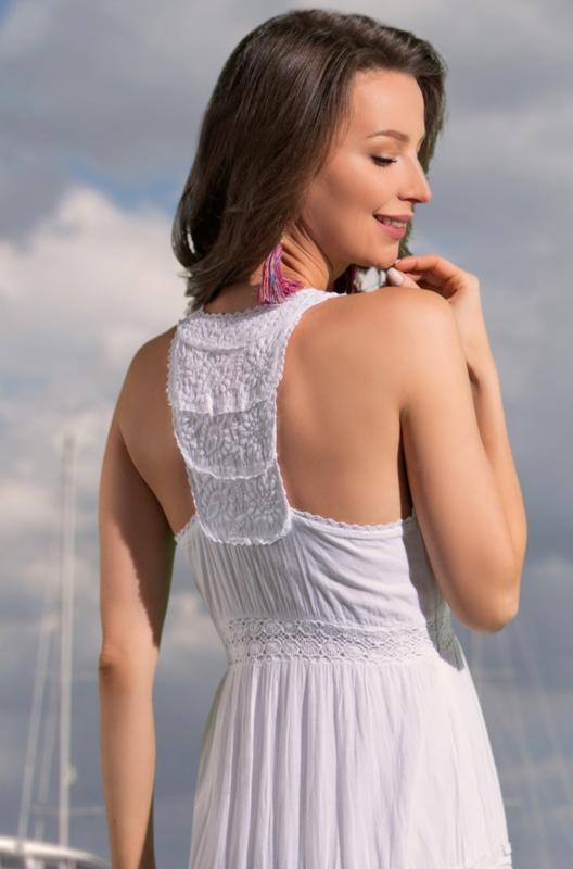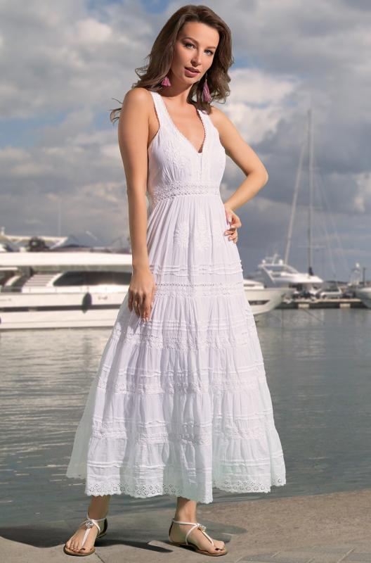 Сарафан Mia-Amore 6898 Argentina Длинный сарафан Mia-Amore без рукавов из хлопкового полотна на широких бретелях.Отрезной лиф платья до талии по фигуре украшен вышивкой. Ярусы нижней части платья декорированы защипами и вышивкой. Платье на тонкой подкладке из хлопка.