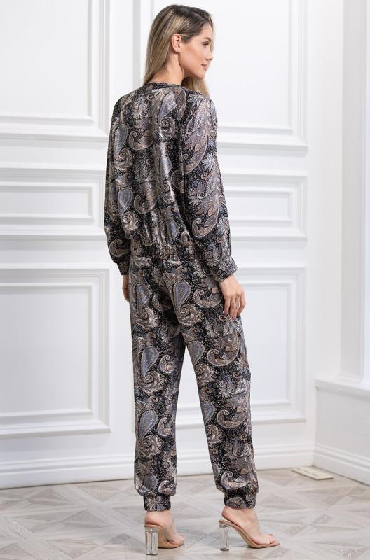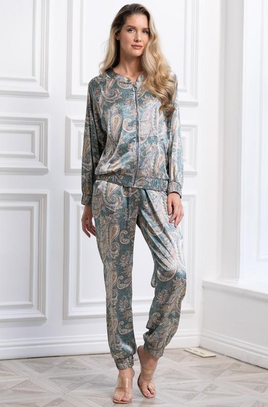 Комплект Mia-Amore состоит из бомбера на молнии и брюк с манжетами на резинке по низу. Бомбер и брюки выполнены из принтованного смесового шелка. По бокам брюк обработаны карманы.