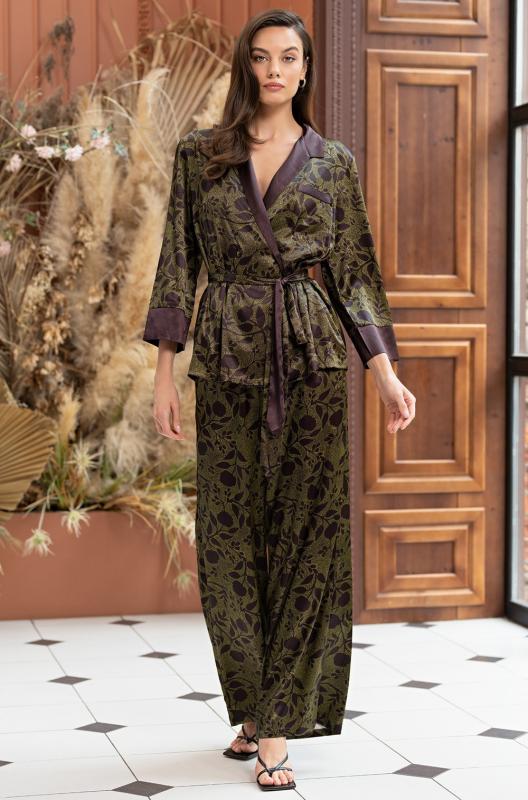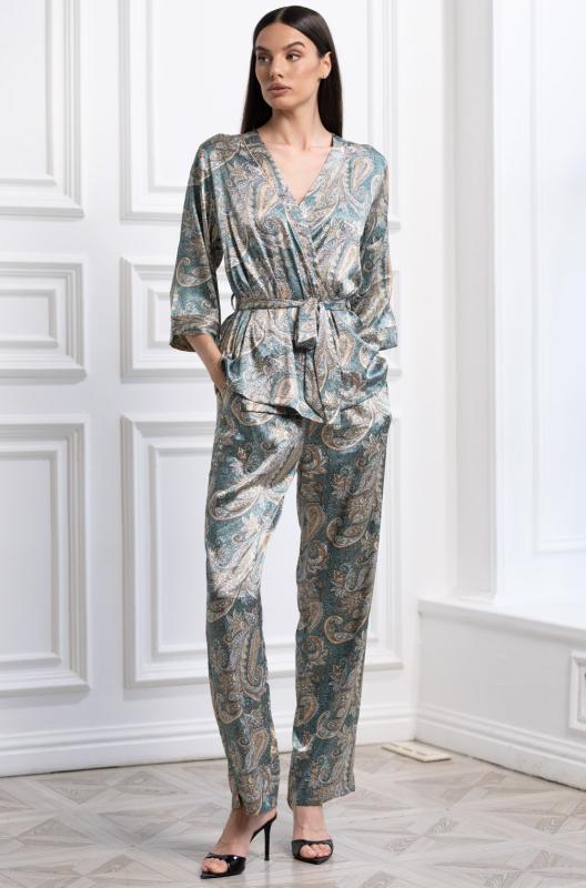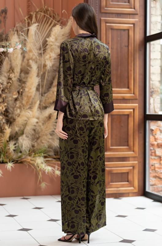 Комплект Mia-Amore состоит из жакета с длинным рукавом и широких брюк. Комплект выполнен из принтованного смесового шелка с однотонной отделкой. По бокам брюк обработаны карманы. Линию талии можно подчеркнуть за счет пояса, который идет в комплекте.