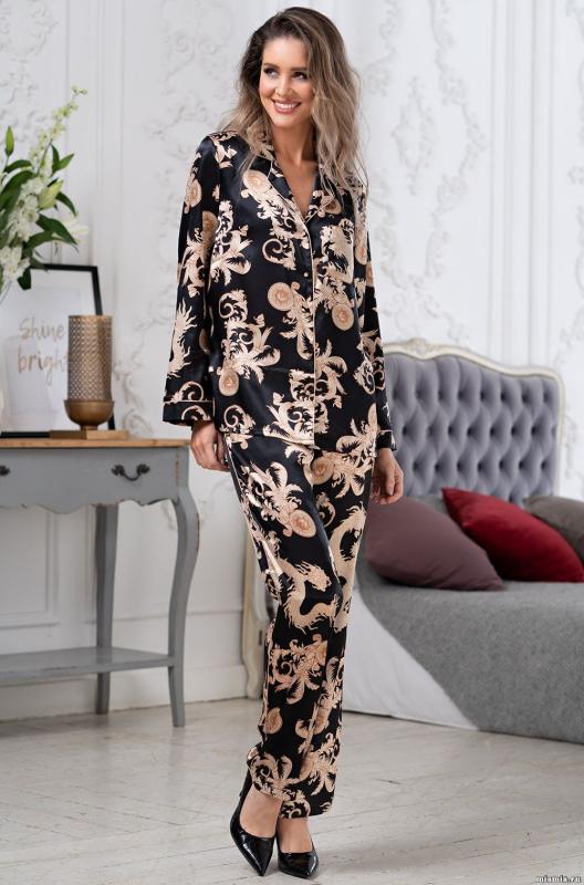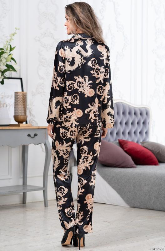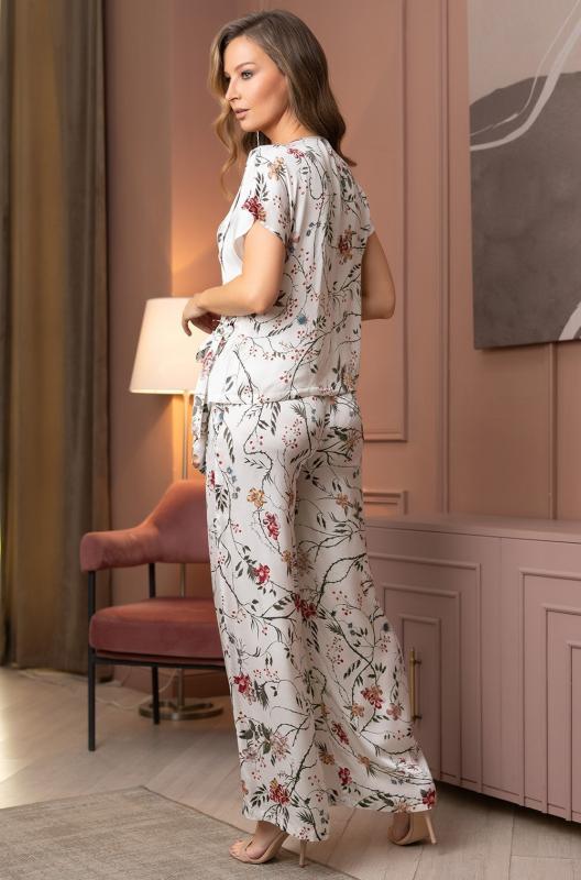 Комплект Mia-Amore состоит из рубашки и брюк, выполнен из принтованной смесовой ткани. Рубашка на пуговицах с рукавом длиной ¾. По бокам брюк расположены карманы, а понизу разрезы.
