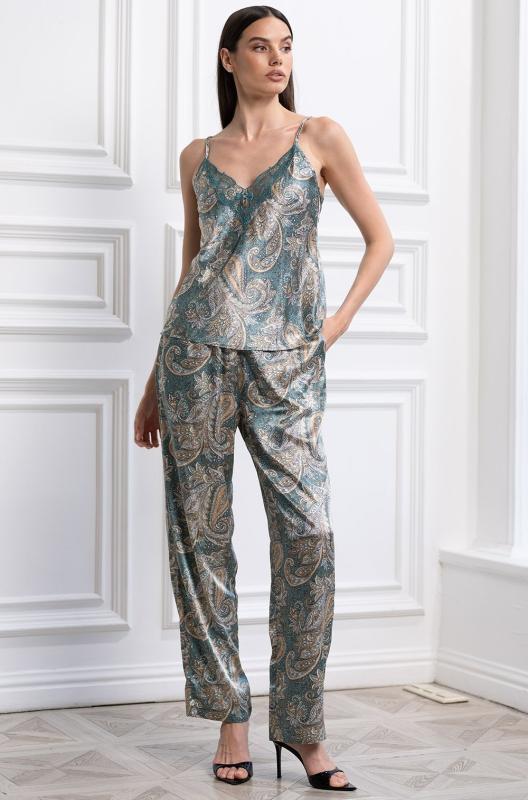 Пижама Mia-Amore 3075 Donatella Комплект Mia-Amore состоит из жакета, топа и брюк. Изделия комплекта выполнены из принтованного смесового шелка. Отделка в виде контрастного канта по краям борта и манжетам жакета. Верх топа украшен кружевной вставкой. По бокам брюк обработаны карманы.