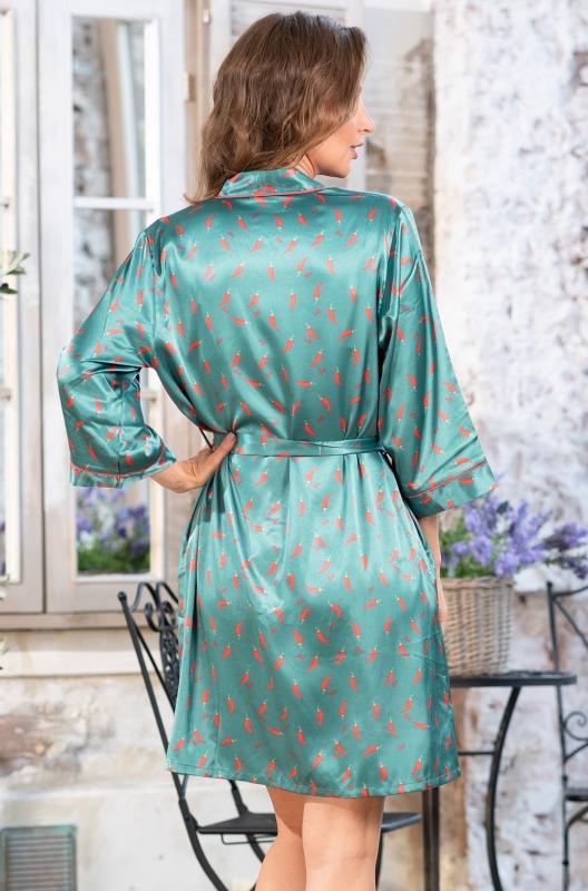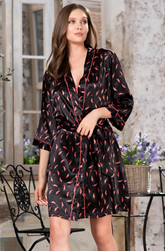 Кимоно Mia-Mella 7073 Julia Peppers Короткий халат Mia-Mella с рукавами 3-4 выполнен из принтованного искусственного шелкового полотна с атласным блеском. Низ рукавов и борт халата декорированы контрастным кантом. Халат на запахе с поясом, в боковых швах есть карманы.