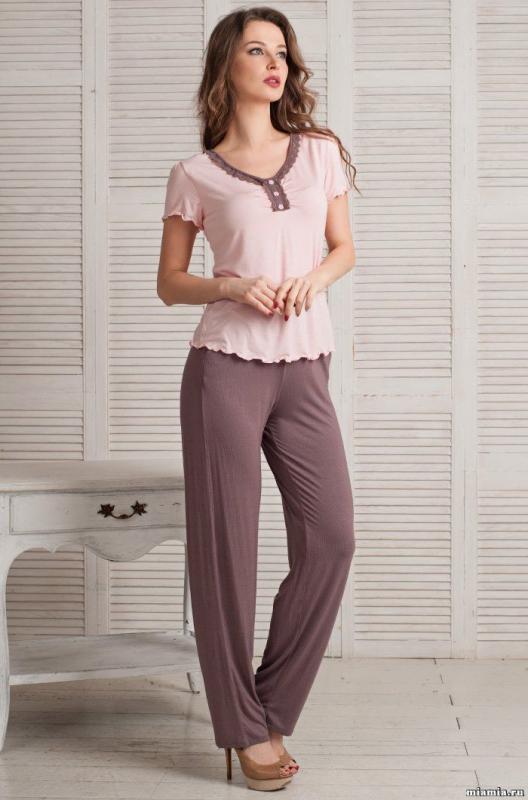 Пижама Mia-Mella 6606 MilenaКомплект Mia-Mella состоит из принтованных брюк и футболки с кроткими рукавами из однотонного трикотажа. Комплект выполнен из мягкого вискозного трикотажного полотна. Вырез горловины декорирован мягким кружевом и декоративной планкой на пуговицах. Состав вискоза 95% эластан 5%