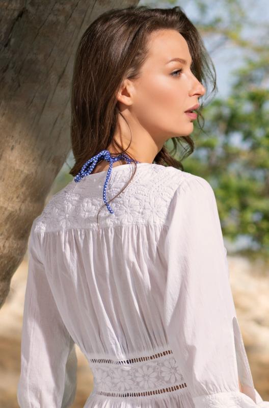 Туника Mia-Amore 6894 Argentina Короткая туника Mia-Amore с рукавом 3-4 выполнена из хлопкового полотна. Область талии на полочке и спинке, верхняя часть спинки, манжеты декорированы вышивкой. Манжеты рукавов фиксируются широкими завязками. Шнуровка спереди с кисточками.
