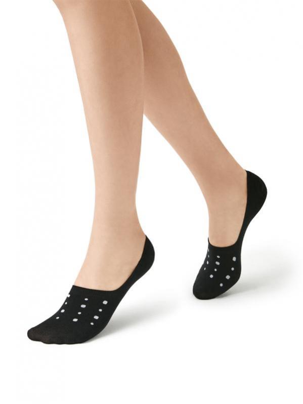 Женские подследники MiNiMi в горошек, укрепленные силиконом. Мягкий и дышащий хлопок в составе обладает высокой воздухопроницаемостью и отлично впитывает влагу, а эластан обеспечивает превосходное облегание. Благодаря специальным силиконовым фиксаторам, подследники плотно прилегают к пятке и не скатываются при ходьбе.