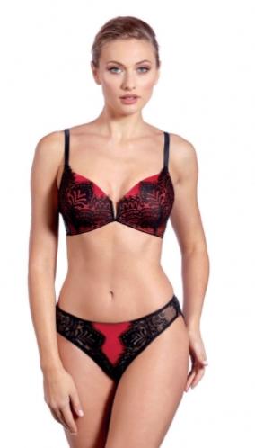 85% ПОЛИАМИД- 10% ЭЛАСТАН- 5% ХЛОПОКБюстгальтер бралетт на тонком поролоне ,выполнен из эластичного кружева и эластичной сетки , а декоративные стрепы добавят дерзости и сексуальности вашему образу. Украшение металлический медальон с логотипом COQUETTE REVUE.