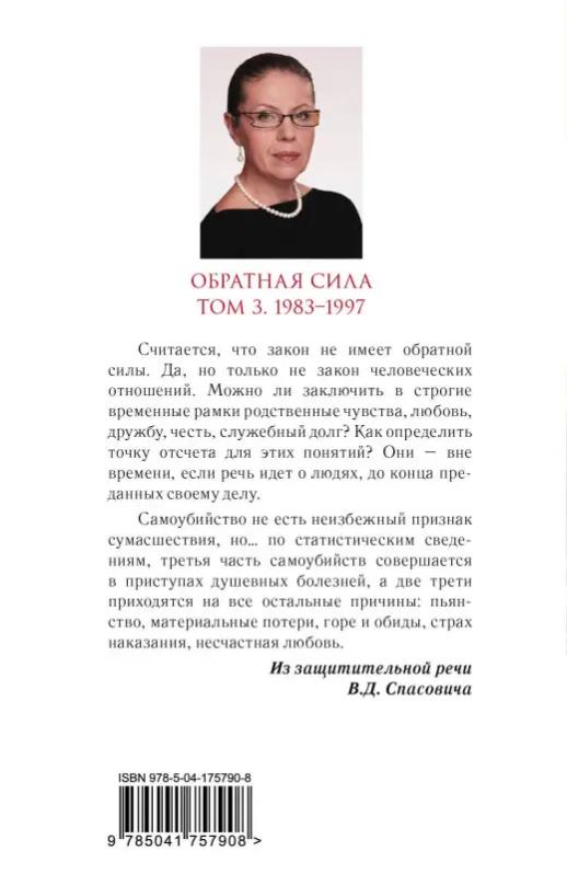 Считается, что закон не имеет обратной силы. Да, но только — не закон человеческих отношений. Можно ли заключить в строгие временные рамки родственные чувства, любовь, дружбу, честь, служебный долг? Как определить точку отсчета для этих понятий? Они — вне времени, если речь идет о людях, до конца преданных своему делу. «Самоубийство не есть неизбежный признак сумасшествия, но… по статистическим сведениям, третья часть самоубийств совершается в приступах душевных болезней, а две трети приходятся на все остальные причины: пьянство, материальные потери, горе и обиды, страх наказания, несчастная любовь». — Из защитительной речи В.Д. Спасовича ------------------------------ «Маринина не только пишет детективные романы, но и отвечает на вечные вопросы. Автор относится к своим читателям как добрый и опытный учитель к ученикам, которые нуждаются в поддержке, подсказке и направлении на верный путь. Оптимистичная и практичная в своей дидактике, Маринина ставит перед собой вопрос “как жить” и старается помочь читателю