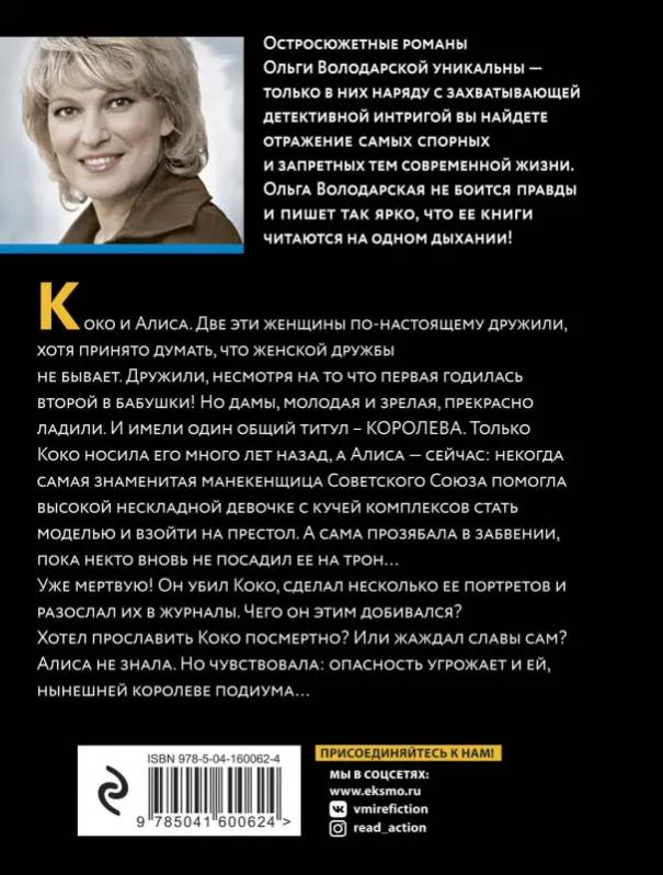 Коко и Алиса. Две эти женщины по-настоящему дружили, хотя принято думать, что женской дружбы не бывает. Дружили, несмотря на то что первая годилась второй в бабушки! Но дамы, молодая и зрелая, прекрасно ладили. И имели один общий титул — КОРОЛЕВА. Только Коко носила его много лет назад, а Алиса — сейчас: некогда самая знаменитая манекенщица Советского Союза помогла высокой нескладной девочке с кучей комплексов стать моделью и взойти на престол. А сама прозябала в забвении, пока некто вновь не посадил ее на трон… Уже мертвую! Он убил Коко, сделал несколько ее портретов и разослал их в журналы. Чего он этим добивался? Хотел прославить Коко посмертно? Или жаждал славы сам? Алиса не знала. Но чувствовала: опасность угрожает и ей, нынешней королеве подиума… Романы Ольги Володарской — остросоциальные детективы, в которых автор препарирует все стороны жизни современного общества, ничего не скрывая и ни о чем не умалчивая. Ее книги написаны так увлекательно, что оторваться просто невозможно. Яркий сочный язык и блес