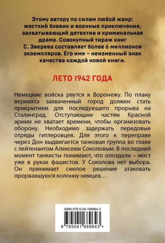 Этому автору по силам любой жанр: жесткий боевик и военные приключения, захватывающий детектив и криминальная драма. Совокупный тираж книг С. Зверева составляет более 6 миллионов экземпляров. Его имя — неизменный знак качества каждой новой книги. Лето 1942 года. Немецкие войска рвутся к Воронежу. По плану вермахта, захваченный город должен стать прикрытием для последующего прорыва на Сталинград. Отступающим частям Красной Армии не хватает времени, чтобы организовать оборону. Необходимо задержать передовые отряды гитлеровцев. Для этого к переправе через Дон выдвигается танковая группа во главе с лейтенантом Алексеем Соколовым. В последний момент танкисты понимают, что опоздали — мост уже в руках фашистов. У Соколова нет выбора. Он принимает смелое решение атаковать прорвавшуюся колонну немцев…