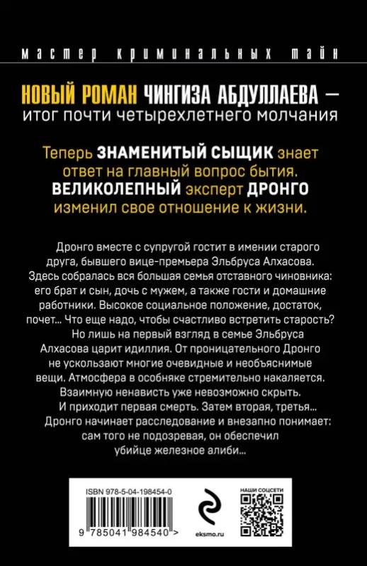 Злободневный остросоциальный детектив Чингиза Абдуллаева. Итог почти четырехлетнего молчания. Теперь знаменитый сыщик знает ответ на главный вопрос бытия. Великолепный эксперт Дронго изменил свое отношение к жизни. Дронго вместе с супругой гостит в имении старого друга, бывшего вице-премьера Эльбруса Алхасова. Здесь собралась вся большая семья отставного чиновника, его брат и сын, дочь с мужем, а также гости и домашние работники. Высокое социальное положение, достаток, почет… Что еще надо, чтобы счастливо встретить старость? Но лишь на первый взгляд в семье Эльбруса Алхасова царит идиллия. От проницательного Дронго не ускользают многие очевидные и необъяснимые вещи. Атмосфера в особняке стремительно накаляется. Взаимную ненависть уже невозможно скрыть. И приходит первая смерть. Затем вторая, третья… Дронго начинает расследование и внезапно понимает: сам того не подозревая, он обеспечил убийце железное алиби… Это незаменимый роман для отцов и детей. Вечная тема в блестящем исполнении мастера детективного жанр