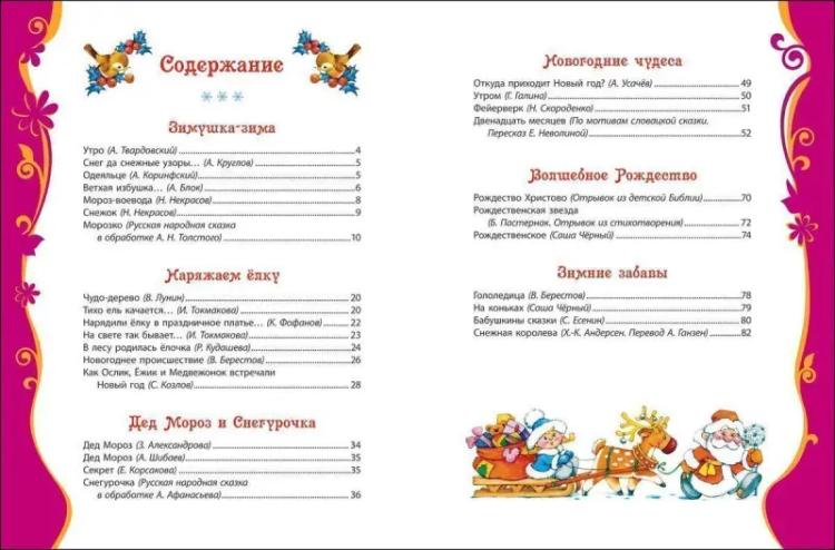 В этой большой новогодней книге собраны замечательные произведения о зиме, новогодних чудесах и ёлочке, Дедушке Морозе и Снегурочке, зимних забавах и, конечно, Рождестве. «Снежная королева» Х.-К. Андерсена, русские народные сказки, стихотворения А. Блока, Н. Некрасова, А. Толстого, А. Твардовского, А. Усачёва, Саши Чёрного и других классиков детской литературы красочно проиллюстрированы талантливыми художниками и переносят нас в мир новогодних чудес. Эта семейная книга для детей, их родителей, бабушек и дедушек подарит удовольствие от чтения увлекательных произведений в уютном домашнем кругу.