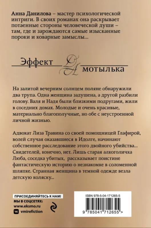 Любовно-криминальные романы с элементами эротики признанного мастера психологического детектива Анны Даниловой. Суммарный тираж книг Анны Даниловой — 4,5 миллиона экземпляров! На залитой вечерним солнцем поляне обнаружили два трупа. Одна женщина задушена, а другой разбили голову. Валя и Надя были близкими подругами, жили в соседних домах. Молодые и очень красивые, материально благополучные, но обе с неустроенной личной жизнью. Адвокат Лиза Травина со своей помощницей Глафирой, волей случая оказавшиеся в Идолге, начинают собственное расследование этого двойного убийства… Свидетелей, конечно, нет. Лишь старая алкоголичка Люба, соседка убитых, рассказывает поистине фантастическую историю о незнакомке в соломенной шляпке. Странная женщина в темной одежде везла детскую коляску...