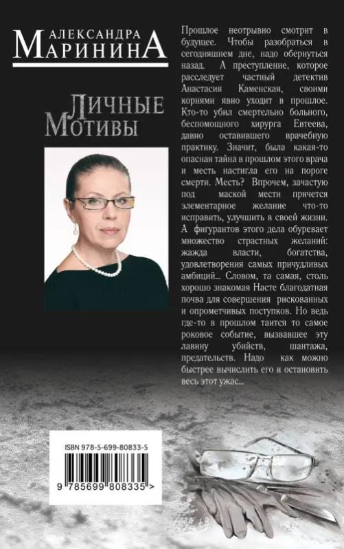 Прошлое неотрывно смотрит в будущее. Чтобы разобраться в сегодняшнем дне, надо обернуться назад. А преступление, которое расследует частный детектив Анастасия Каменская, своими корнями явно уходит в прошлое. Кто-то убил смертельно больного, беспомощного хирурга Евтеева, давно оставившего врачебную практику. Значит, была какая-та опасная тайна в прошлом этого врача, и месть настигла его на пороге смерти. Месть? Впрочем, зачастую под маской мести прячется элементарное желание что-то исправить, улучшить в своей жизни. А фигурантов этого дела обуревает множество страстных желаний: жажда власти, богатства, удовлетворения самых причудливых амбиций… Словом, та самая, столь хорошо знакомая Насте, благодатная почва для совершения рискованных и опрометчивых поступков. Но ведь где-то в прошлом таится то самое роковое событие, вызвавшее эту лавину убийств, шантажа, предательств. Надо как можно быстрее вычислить его и остановить весь этот ужас… Отзывы: «Маринина не только пишет детективные романы, но и отвечает на вечные