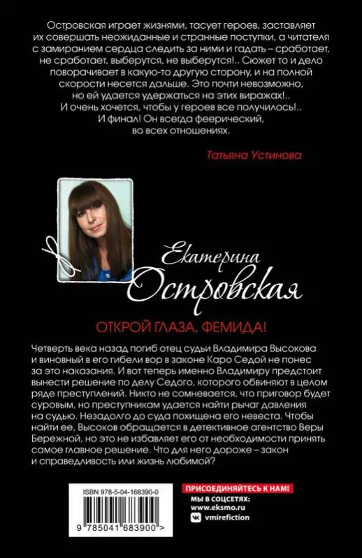 Четверть века назад погиб отец судьи Владимира Высокова, но виновный в его гибели вор в законе Каро Седой не понес за это наказания. И вот теперь именно Владимиру предстоит вынести решение по делу Седого, которого обвиняют в целом ряде преступлений. Никто не сомневается, что приговор будет суровым, но преступникам удается найти рычаг давления на судью — была похищена его невеста. Чтобы найти ее, Высоков обращается в детективное агентство Веры Бережной, но это не избавляет его от необходимости сделать выбор… Татьяна Устинова рекомендует: «Островская играет жизнями, тасует героев, заставляет их совершать неожиданные и странные поступки, а читателя — с замиранием сердца следить за ними и гадать — сработает, не сработает, выберутся, не выберутся!.. Сюжет то и дело поворачивает в какую-то другую сторону и на полной скорости несется дальше. Это почти невозможно, но ей удается удержаться на этих виражах!.. И очень хочется, чтобы у героев все получилось!.. И финал! Он всегда феерический, во всех отношениях».
