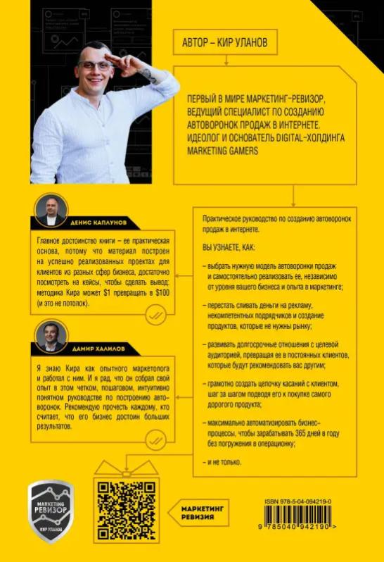 Кир Уланов – маркетинг-ревизор, за плечами которого более 1500 проектов разного уровня. В книге-тренинге Кир максимально понятным языком на примерах реальных бизнесов пошагово раскрывает все этапы создания и внедрения автоворонок продаж. Изучив это практическое руководство, вы узнаете, как: – перестать сливать деньги на рекламу, некомпетентных подрядчиков и создание продуктов, которые не нужны рынку; – выбрать нужную модель автоворонки продаж и самостоятельно реализовать ее, независимо от уровня вашего бизнеса и опыта в маркетинге; – максимально автоматизировать бизнес-процессы, чтобы зарабатывать 365 дней в году без погружения в операционку; – грамотно выстроить цепочку касаний с клиентом, шаг за шагом подводя его к покупке самого дорогого продукта; – развивать долгосрочные отношения с целевой аудиторией, превращая ее в постоянных клиентов, которые будут рекомендовать вас другим; – и не только.