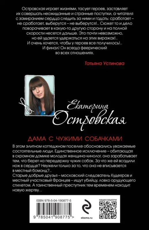 В этом элитном коттеджном поселке обосновались уважаемые состоятельные люди. Единственное исключение — обитающая в скромном домике молодая женщина-кинолог, она зарабатывает тем, что берет на передержку чужих собак. За что же ей всадили нож в сердце? Неужели только за то, что она не вписывается в местный бомонд? Старые добрые друзья — московский следователь Кудеяров и местный участковый Францев — ищут убийцу, ловко орудующего стилетом. А таинственный преступник тем временем находит новую жертву… Татьяна Устинова рекомендует: «Островская играет жизнями, тасует героев, заставляет их совершать неожиданные и странные поступки, а читателя — с замиранием сердца следить за ними и гадать: сработает, не сработает, выберутся, не выберутся!.. Сюжет то и дело поворачивает в какую-то другую сторону и на полной скорости несется дальше. Это почти невозможно, но ей удается удержаться на этих виражах!.. И очень хочется, чтобы у героев все получилось!.. И финал! Он всегда феерический, во всех отношениях».