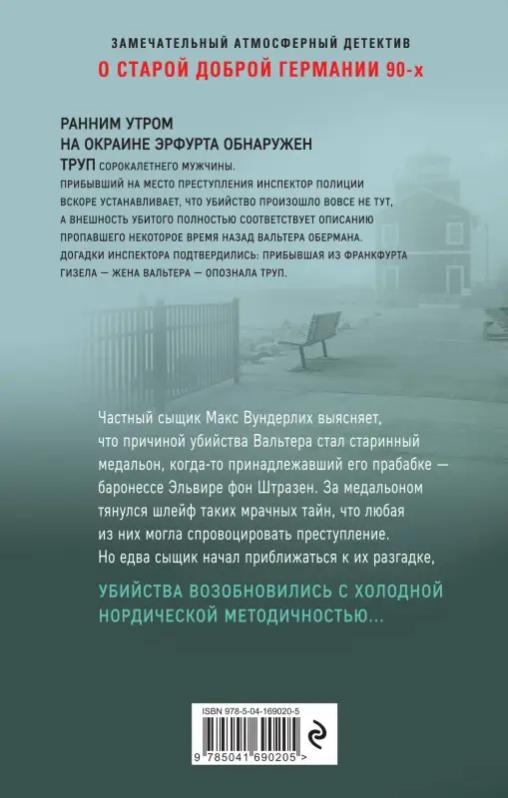 Замечательный атмосферный детектив о старой доброй Германии 90-х, когда жизнь казалась беззаботной, милой и вечной._x000D_ _x000D_ Ранним утром на окраине Эрфурта обнаружен труп сорокалетнего мужчины. Прибывший на место преступления инспектор полиции вскоре устанавливает, что убийство произошло вовсе не тут, а внешность убитого полностью соответствует описанию пропавшего некоторое время назад Вальтера Обермана. _x000D_ Догадки инспектора подтвердились: прибывшая из Франкфурта Гизела — жена Вальтера — опознала труп. _x000D_ Частный сыщик Макс Вундерлих выясняет, что причиной убийства Вальтера стал старинный медальон, когда-то принадлежащий его прабабке — баронессе Эльвире фон Штразен. За медальоном тянулся шлейф таких мрачных тайн, что любая из них могла спровоцировать преступление._x000D_ Но едва сыщик начал приближаться к их разгадке, убийства возобновились с холодной нордической методичностью…