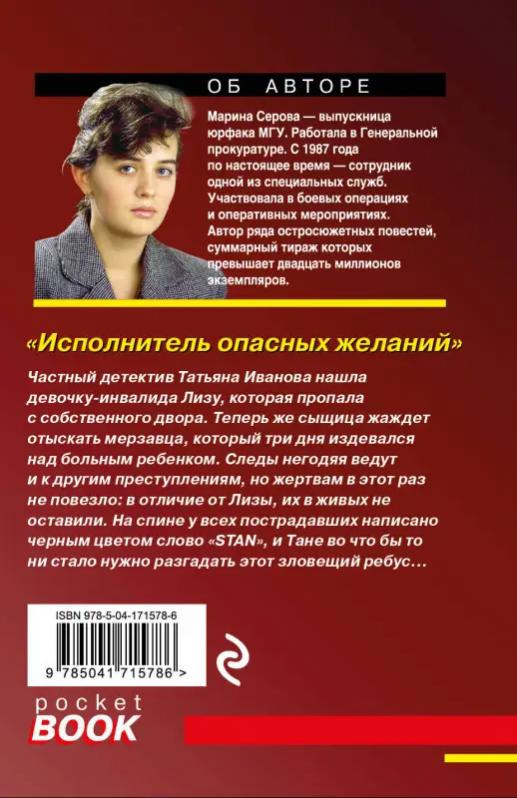 Марина Серова — феномен современного отечественного детективного жанра. Выпускница юрфака МГУ, работала в Генеральной прокуратуре. С 1987 года по настоящее время — сотрудник одной из специальных служб. Участвовала в боевых операциях и оперативных мероприятиях. Автор ряда остросюжетных повестей, суммарный тираж которых превышает двадцать миллионов экземпляров. Частный детектив Татьяна Иванова нашла девочку-инвалида Лизу, которая пропала с собственного двора. Теперь же сыщица жаждет отыскать мерзавца, который три дня издевался над больным ребенком. Следы негодяя ведут и к другим преступлениям, но жертвам в этот раз не повезло, в отличие от Лизы, их в живых не оставили. На спине у всех пострадавших написано черным цветом словом «STAN», и Тане во что бы то ни стало нужно разгадать этот зловещий ребус…