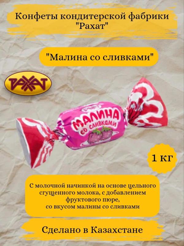 С молочной начинкой на основе цельного сгущенного молока, с добавлением фруктового пюре, со вкусом малины со сливками. В 100 г продукта содержится: Белков 0,6 грамм Жиров 0,8 грамм Углеводов 91,8 грамм Энергетическая ценность 363 ккал