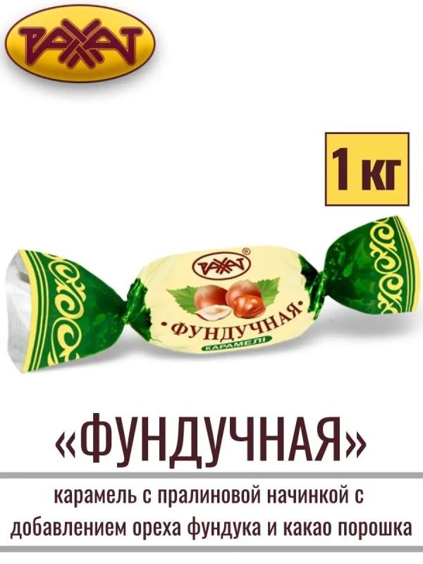 Карамель с пралиновой начинкой с добавлением ореха фундука и какао порошка.