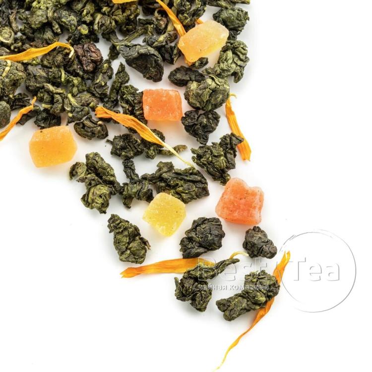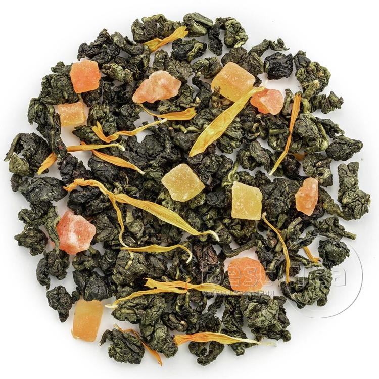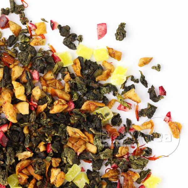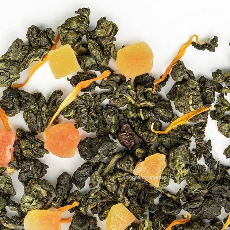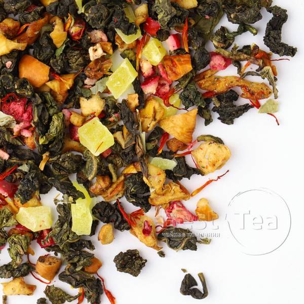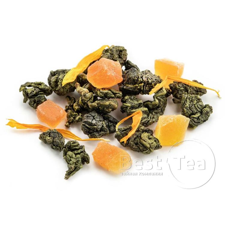 Тонкое созвучие китайского улуна, кусочков папайи и лепестков календулы. Солнечная цветовая композиция составлена из желтых и оранжевых оттенков фруктовых кусочков и цветочных лепестков на фоне зелени чайного листа. Тропическая сладость папайи и экзотический аромат манго по новому раскрывают вкус китайского чая. При заваривании сухая россыпь превращается в ароматный прозрачно-янтарный настой.