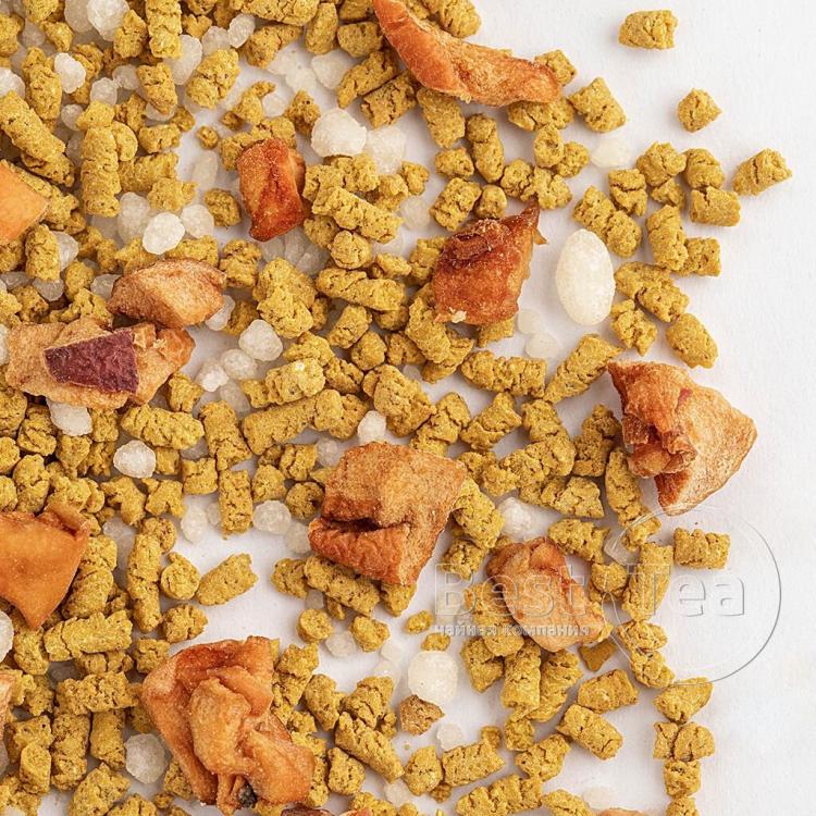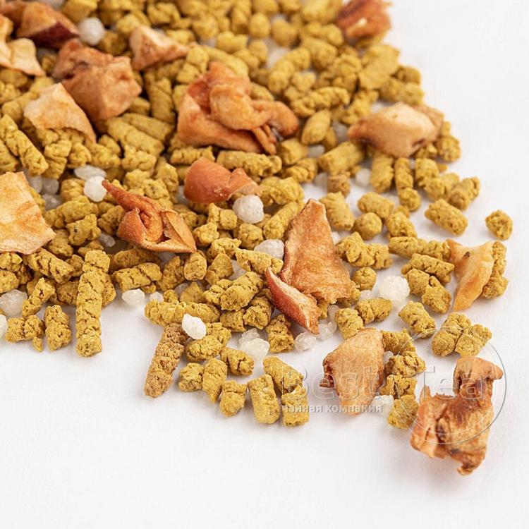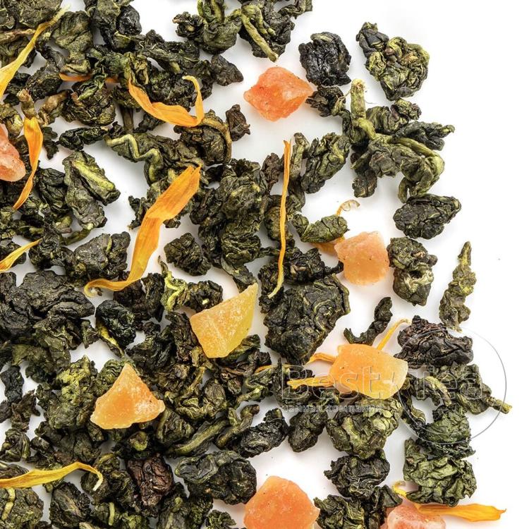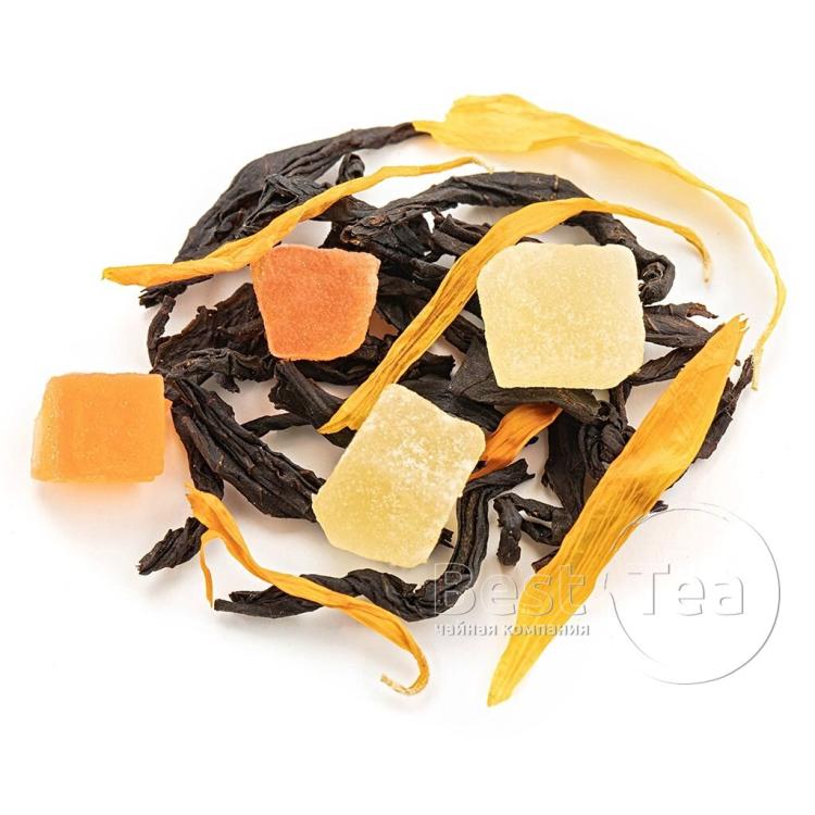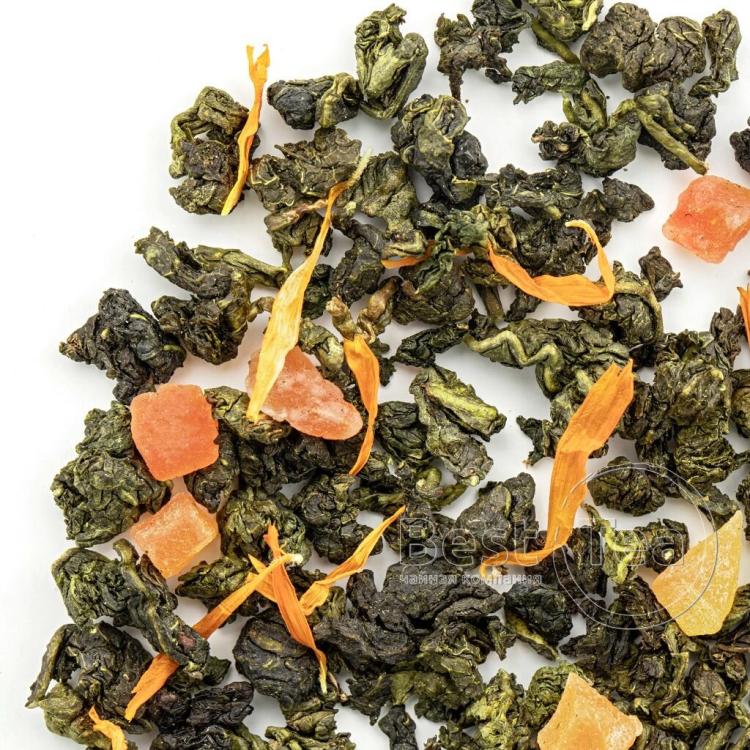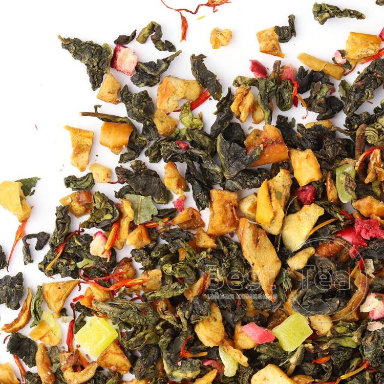 Тонкое созвучие китайского улуна, кусочков папайи и лепестков календулы. Солнечная цветовая композиция составлена из желтых и оранжевых оттенков фруктовых кусочков и цветочных лепестков на фоне зелени чайного листа. Тропическая сладость папайи и экзотический аромат манго по новому раскрывают вкус китайского чая. При заваривании сухая россыпь превращается в ароматный прозрачно-янтарный настой.