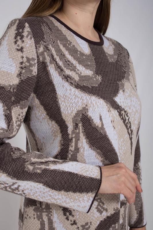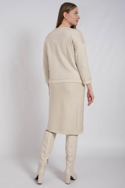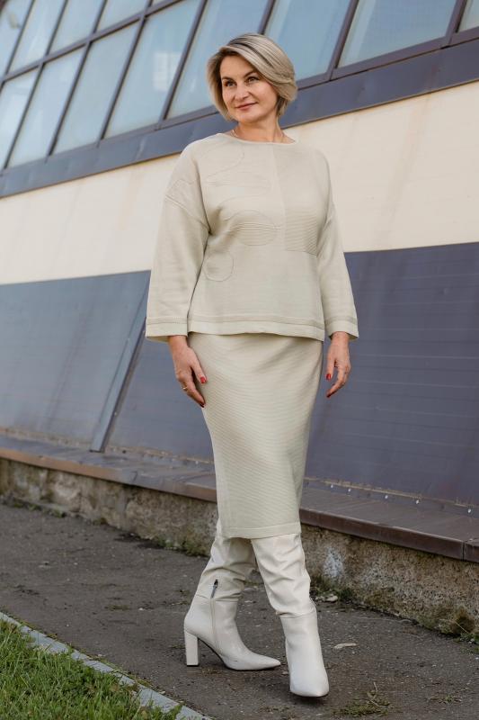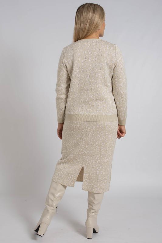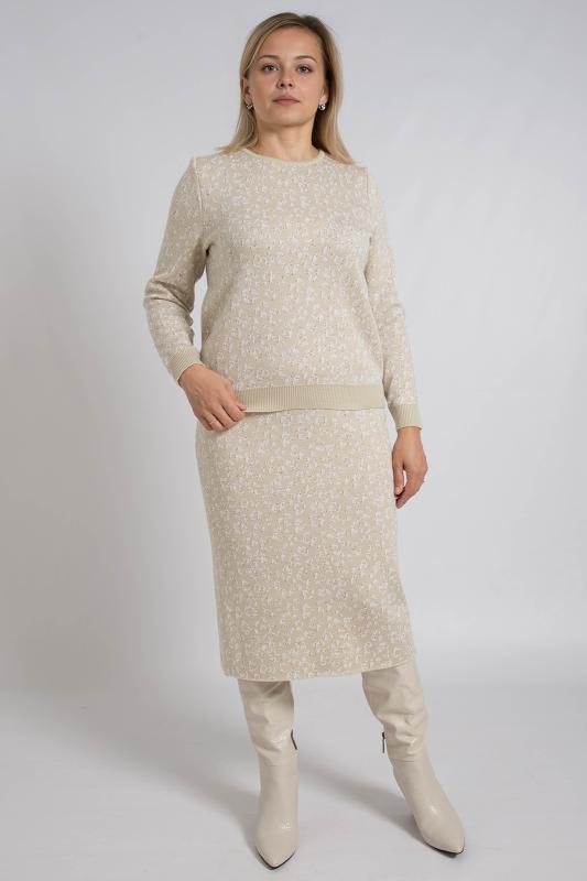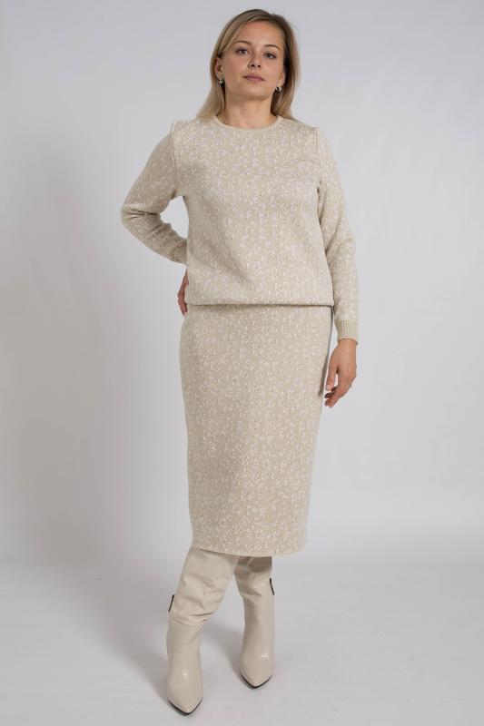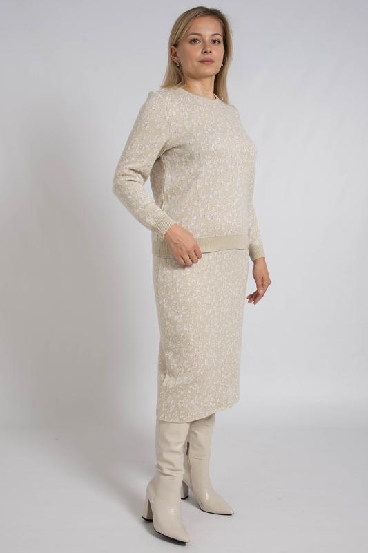 Женский трикотажный костюм с юбкой карандаш, теплый, приятный к телу, изготовлен из высококачественной пряжи в сочетании с люрексом. Юбка длинной миди с разрезом сзади. Джемпер с длинным втачным рукавом. Горловина круглая. По низу изделия и низу рукава ластичная манжета. Модный костюм с юбкой подойдет как на каждый день, так и для отдыха и на работу. Нейтральный бежевый цвет в сочетании с принтом "