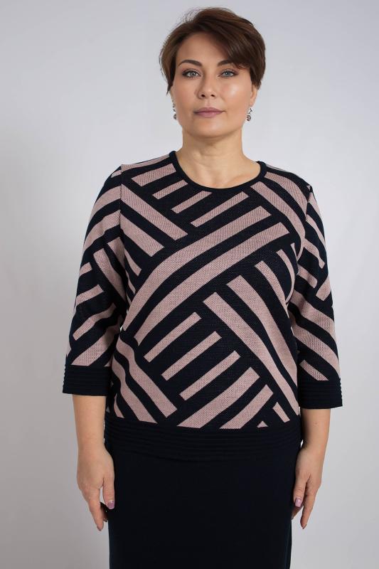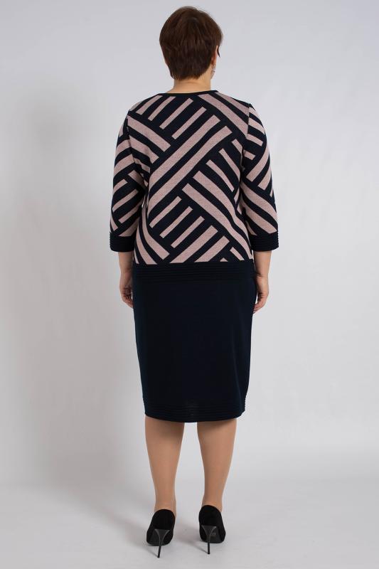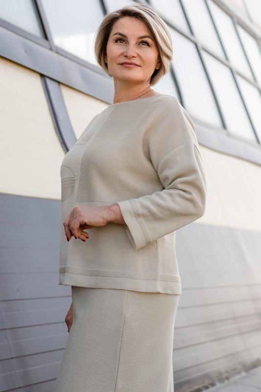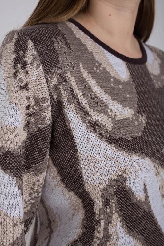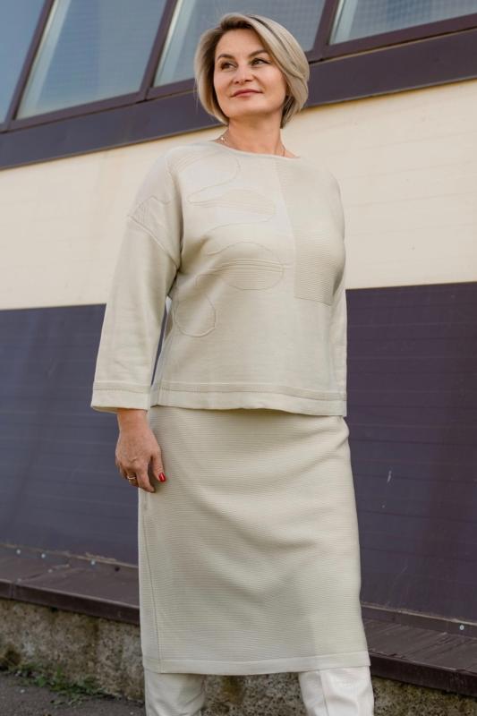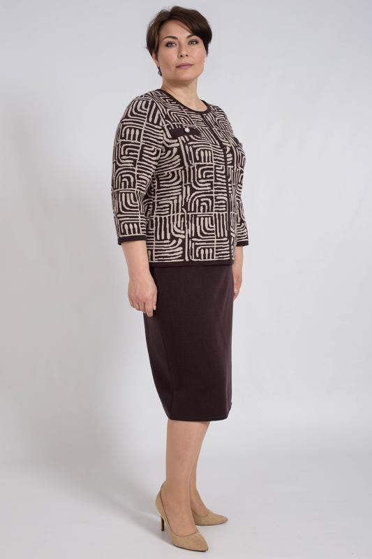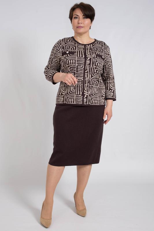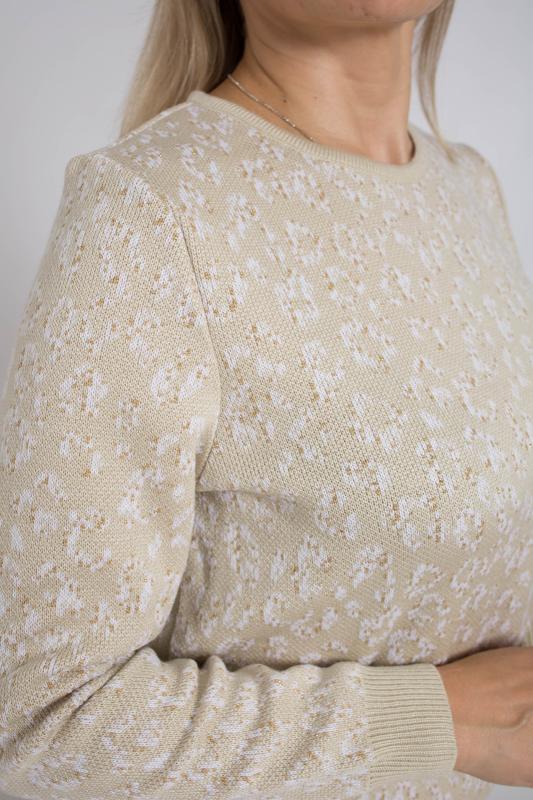 Женский трикотажный костюм с юбкой карандаш, теплый, приятный к телу, изготовлен из высококачественной пряжи в сочетании с люрексом. Юбка длинной миди с разрезом сзади. Джемпер с длинным втачным рукавом. Горловина круглая. По низу изделия и низу рукава ластичная манжета. Модный костюм с юбкой подойдет как на каждый день, так и для отдыха и на работу. Нейтральный бежевый цвет в сочетании с принтом "