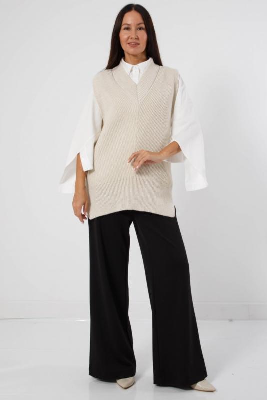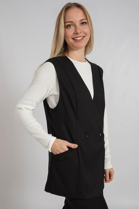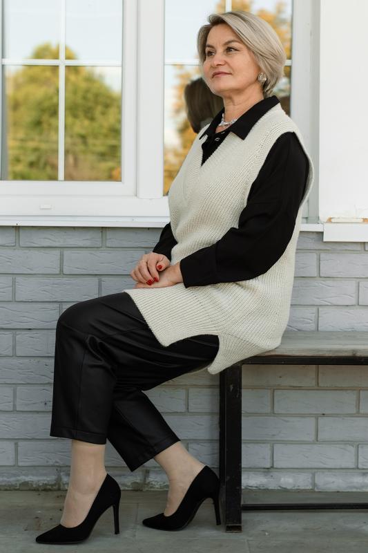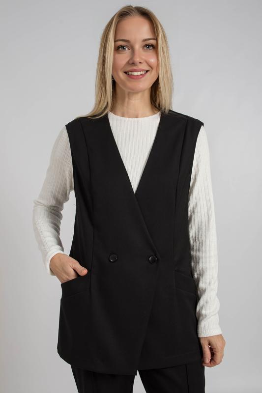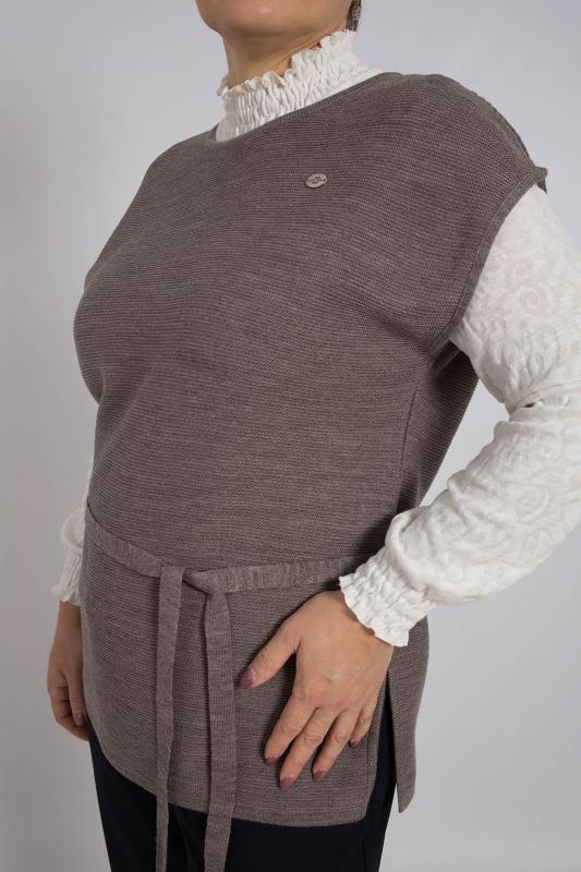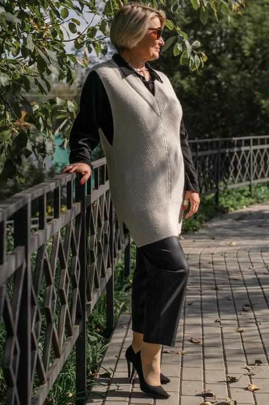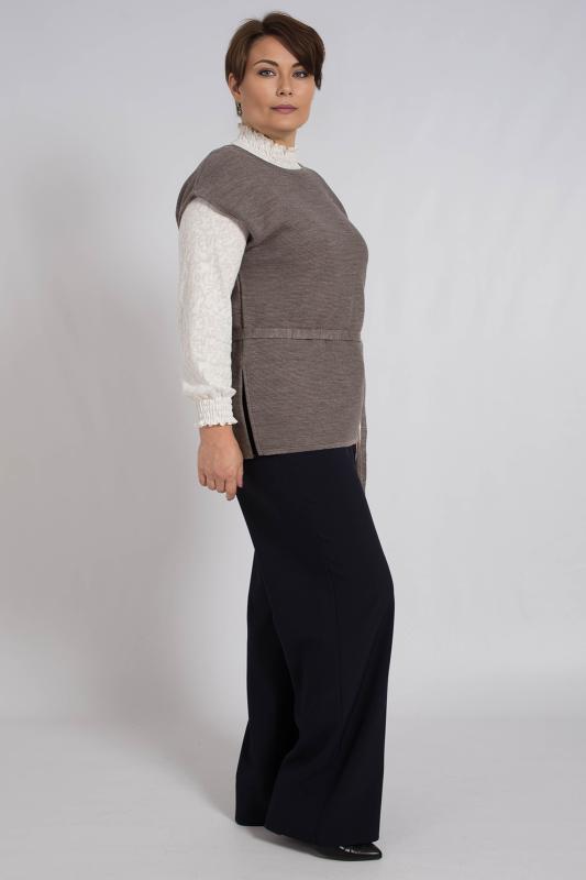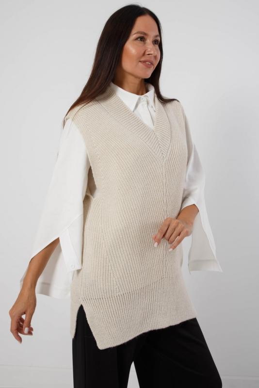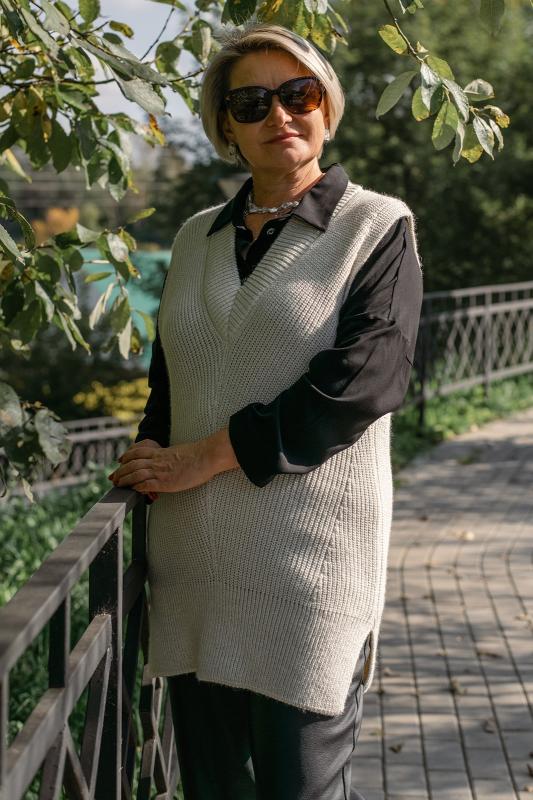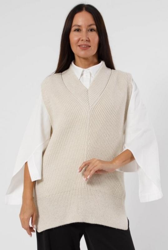 Жилет трикотажный связан платочным переплентением с высокими разрезами в боковых швах. Плечо расширенного кроя. На полочке в районе груди пришит фирменный логотип. Подходит для поведневной носки с водолазкой и для офиса с рубашкой или блузкой. Очень практичный и удобный.