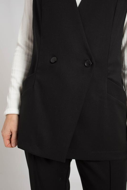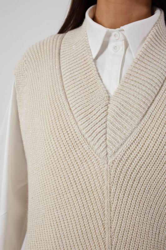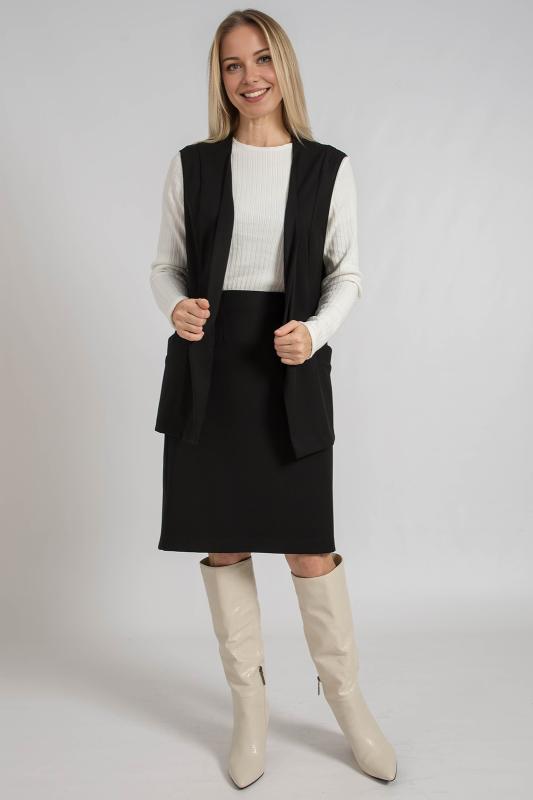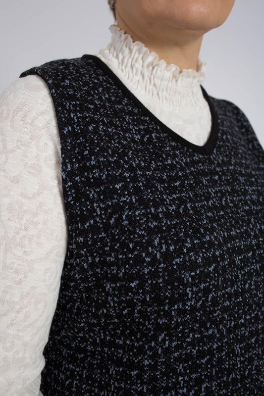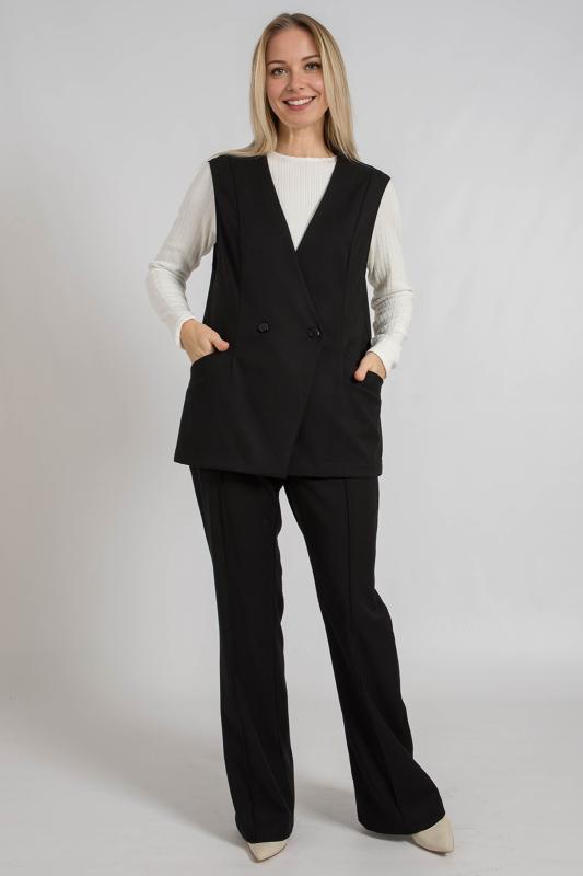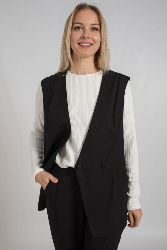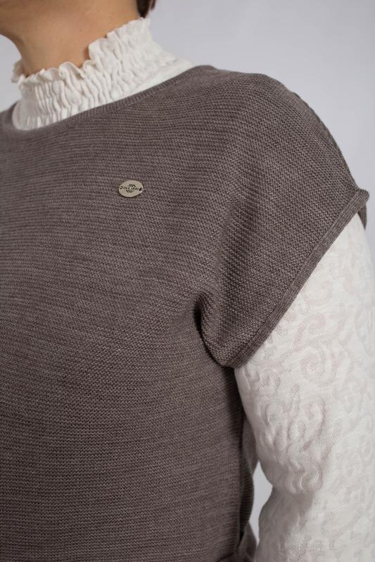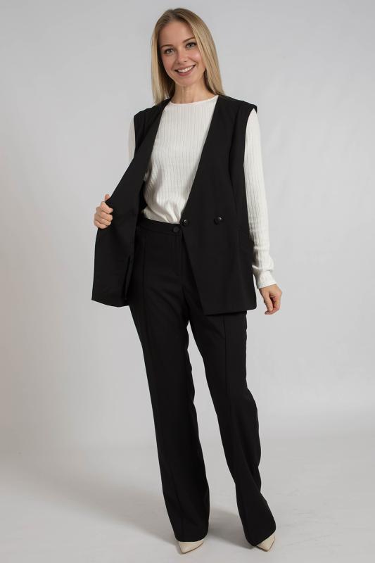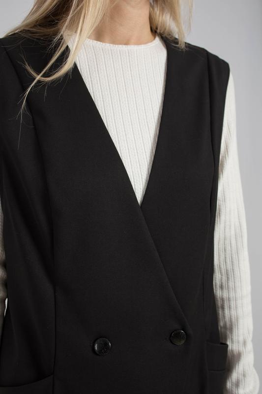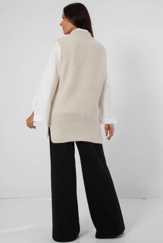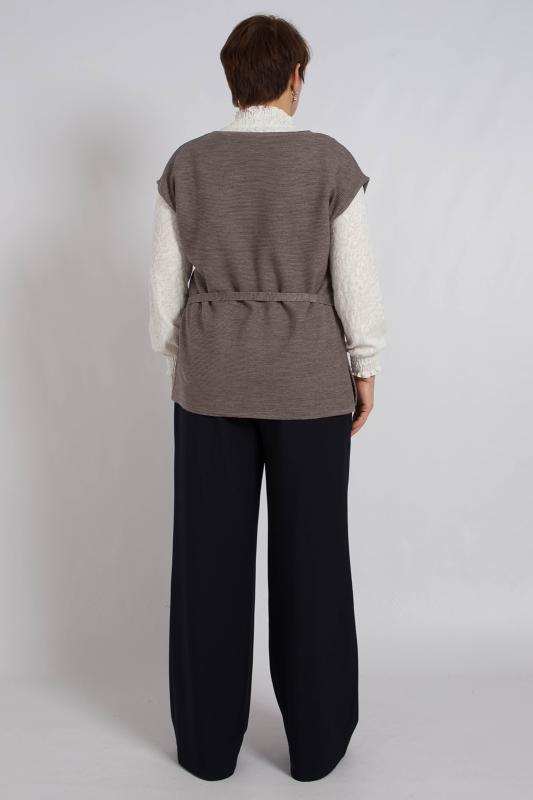 Жилет трикотажный связан платочным переплентением с высокими разрезами в боковых швах. Плечо расширенного кроя. На полочке в районе груди пришит фирменный логотип. Подходит для поведневной носки с водолазкой и для офиса с рубашкой или блузкой. Очень практичный и удобный.
