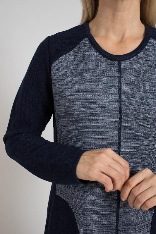 Красивое женское платье связано платочной вязкой и скомбинировано из двухцветного темного полотна (спинка, рукава, боковые части и кокетки полочки, накладные карманы) и однотонного светлого полотна (средняя часть полочки). Платье полуприлегающего силуэта, умеренного объема, с длинными втачными рукавами. Круглый вырез горловины окантован вязаной бейкой-трубкой кеттельным швом. По середине полочки проложен декоративный 5-ниточный шов пряжей темного цвета.