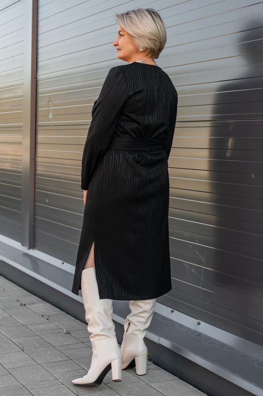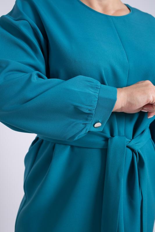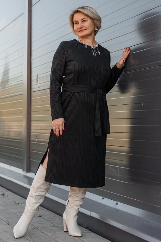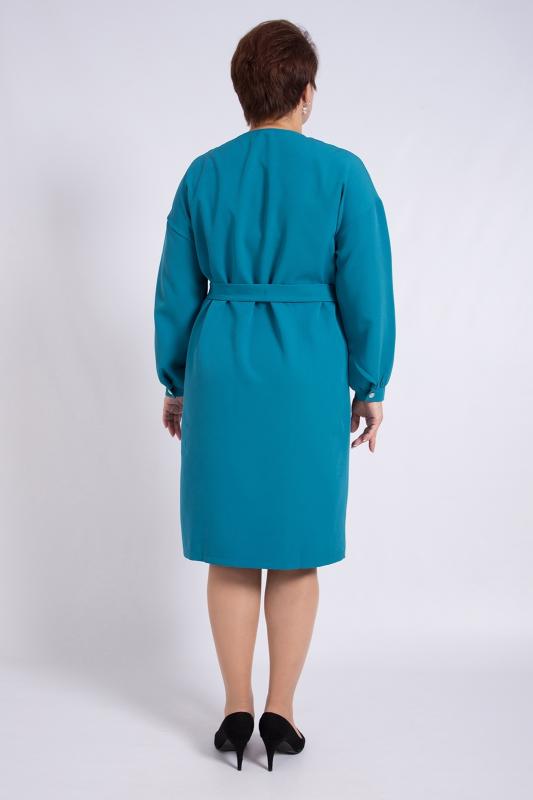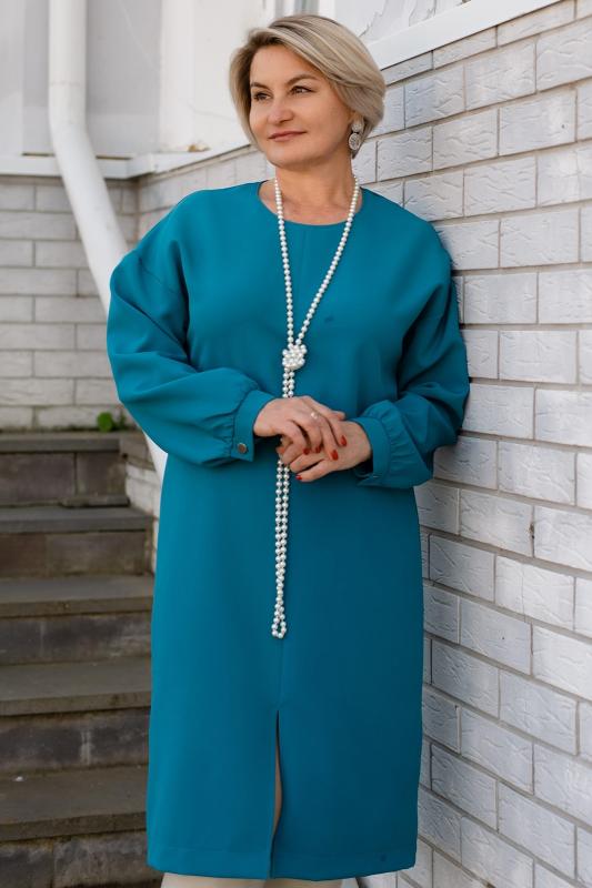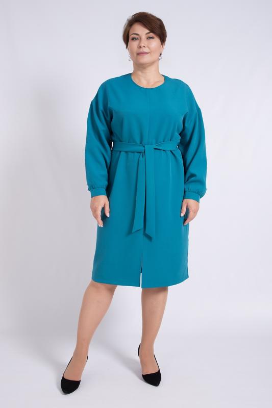 Платье женское офисное.Выполнено из полотна поливискоза, приятного к телу. Платье прямого силуэта, длина чуть ниже колена, рукава длинные, плечевой пояс приспущенный. Круглая горловина окантована кантом из основного полотна. Низ рукавов дополнен манжетами на застежке. В центральном шве полочки имеется разрез. К платью прилагается пояс из основного полотна. Силуэт платья выгодно подчеркивает красоту фигуры, создает деловой образ.
