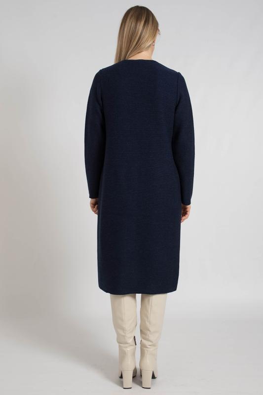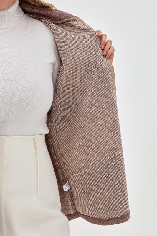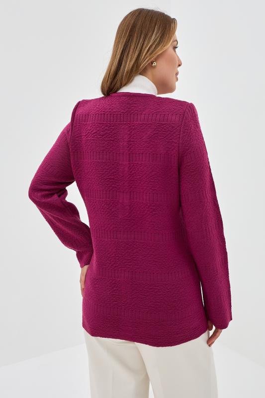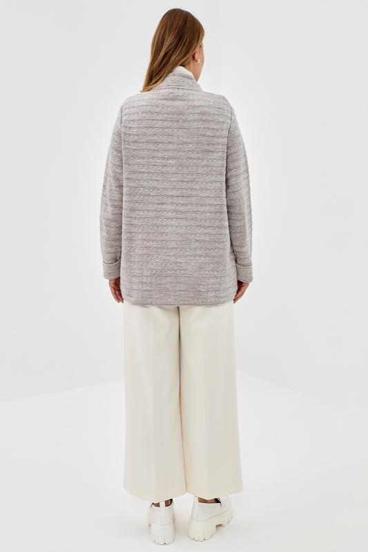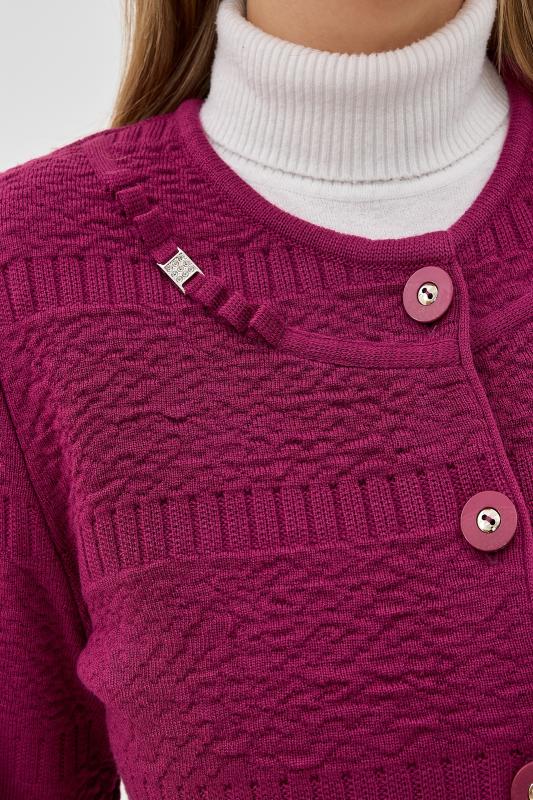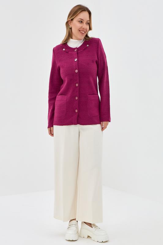Элегантный женский жакет связан красивым однотонным комбинированным переплетением. Жакет полуприлегающего силуэта, умеренного объема, слегка удлиненный, с длинными втачными рукавами. Круглый вырез горловины окантован вязаной бейкой-трубкой. Застежка центральная на прорезные петли и пуговицы. На полочках выполнены накладные карманы. Полочки в области горловины украшены декоративной узкой планкой и металлическими пряжками со стразами. Жакет дополнен верхними плечевыми накладками.