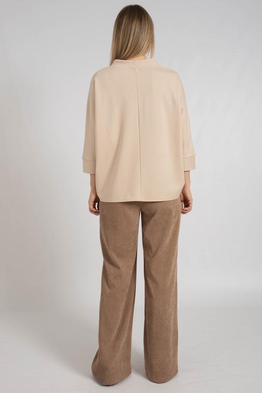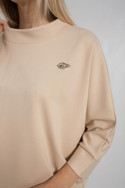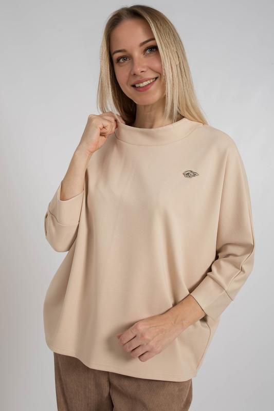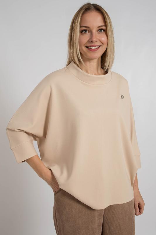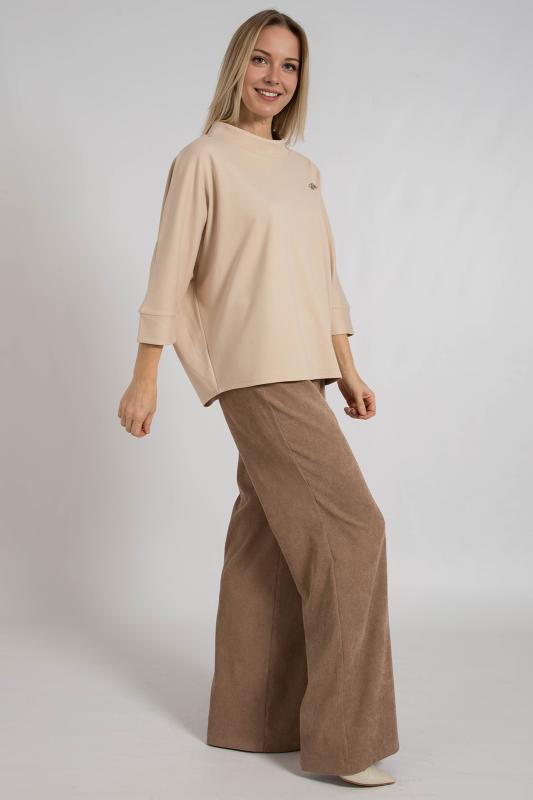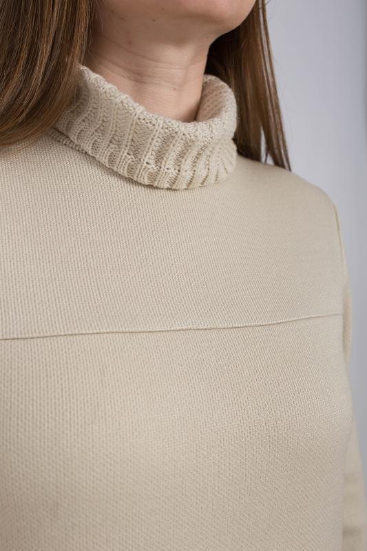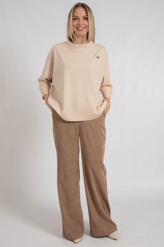 Джемпер с цельнокроенными рукавами, выполнен из трикотажного полотна свободного кроя средней длины. Круглая горловина дополнена воротником стойка. Низ рукавов на манжете.