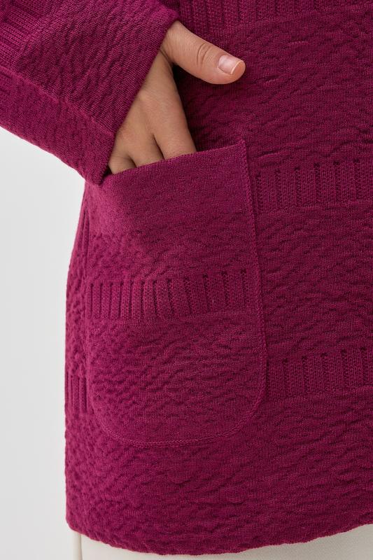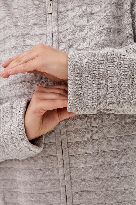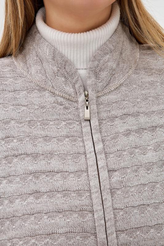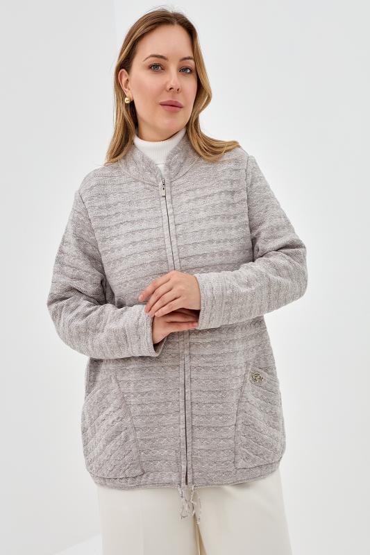 Теплая женская трикотажная куртка - жакет, связанная плотным рельефным переплетением, с длинными втачными рукавами и с небольшим воротником - стойкой. Застежка на разъемную тесьму - "