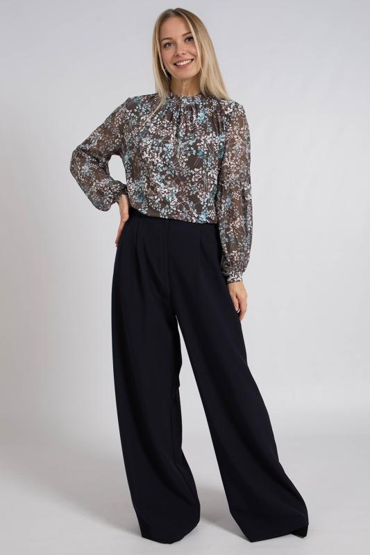 Нарядный джемпер полуприлегающего силуэта средней длины с втачными объемными шифоновыми рукавами. Спереди на горловине заложена сборка. Горловина оформлена воротником со стойкой, которая застегивается на пуговицы сзади. Джемпер подойдет как для нарядного, так и повседневного варианта.
