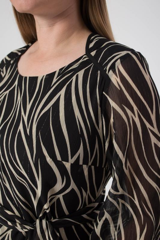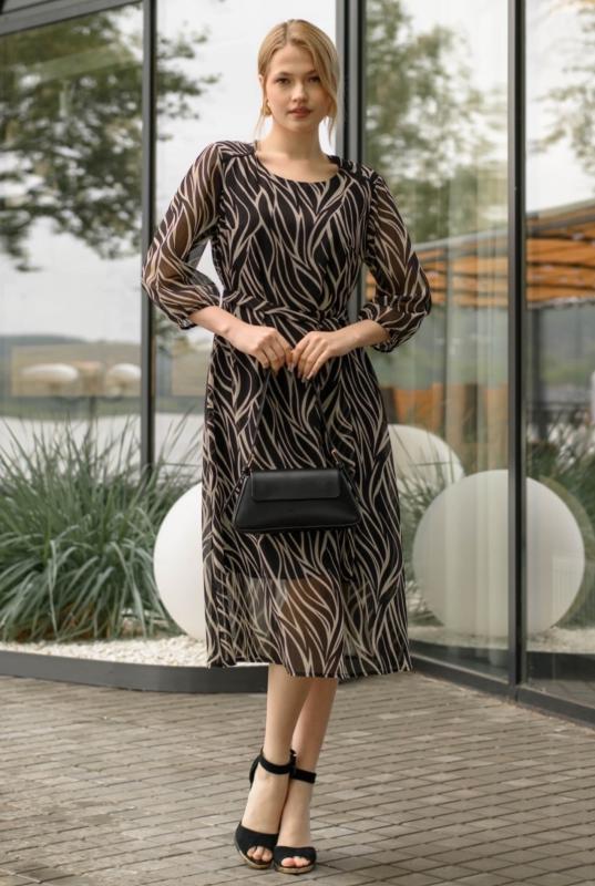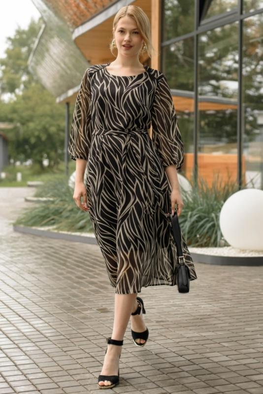 Платье женское из комбинированных полотен. Отрезное по линии талии. Рукава втачные , длина 3-4. Горловина круглой формы. На шифоне имеются боковые разрезы.