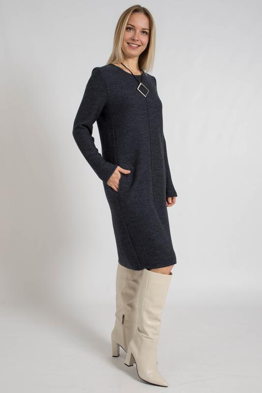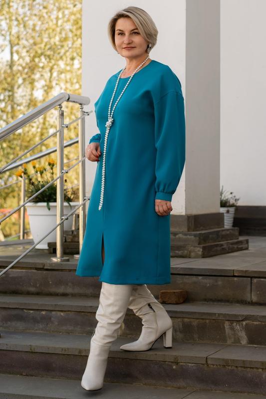 Стильное платье полуприлегающего кроя. Выполнено из теплого трикотажного полотна. Круглый неглубокий вырез горловины. Рукава втачные длинные. Низ ровный, с разрезом с левой стороны. Прекрасно подойдет для офиса и повседневной носки.