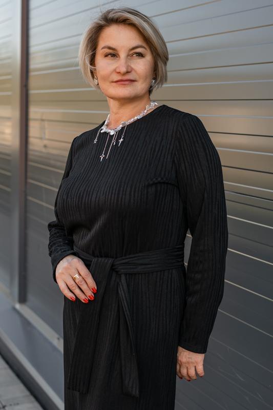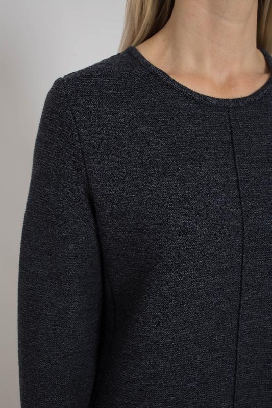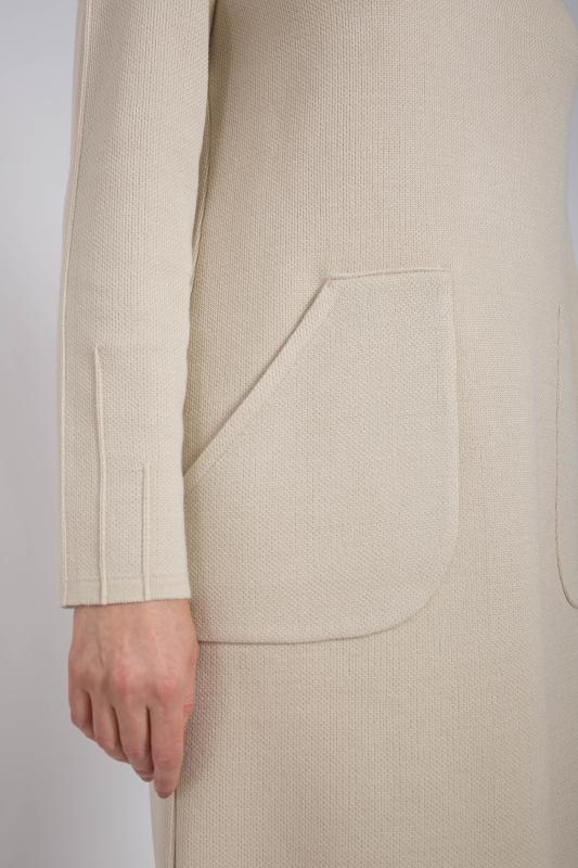 . Платье полуприлегающего силуэта, умеренного объема, с длинными втачными рукавами.В переходящих на полочку боковых швах выполнены внутренние карманы. По центру полочки выполнен вертикальный защип ( строчка 0,3 см.) , благодаря которому фигура выглядит стройнее.