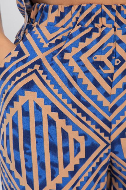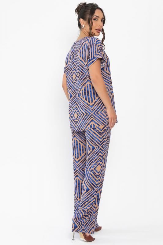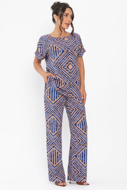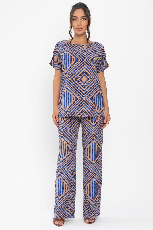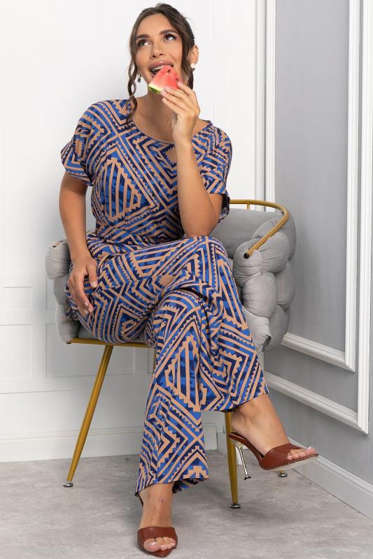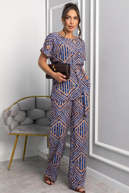 Обновите свой летний гардероб с помощью этого комфортного костюма! Брюки-палаццо с эластичной резинкой по талии обеспечивают идеальную посадку и комфорт в течение всего дня. Верх с ярким принтом в виде графических узоров и округлым вырезом придаёт образу свежесть и лёгкость. Застёжка на пуговицу сзади делает костюм аккуратным и завершённым. Этот костюм идеально подходит для создания стильных и непринуждённых образов в тёплую погоду!