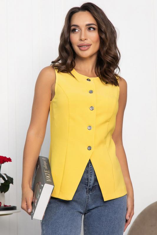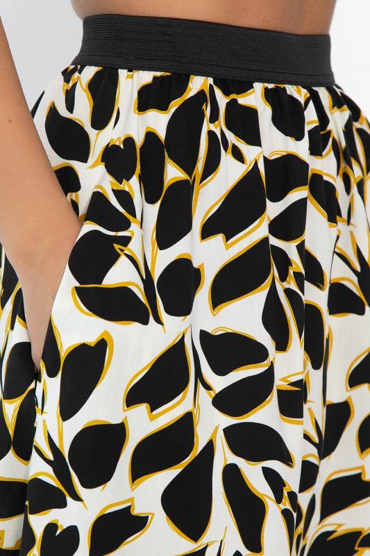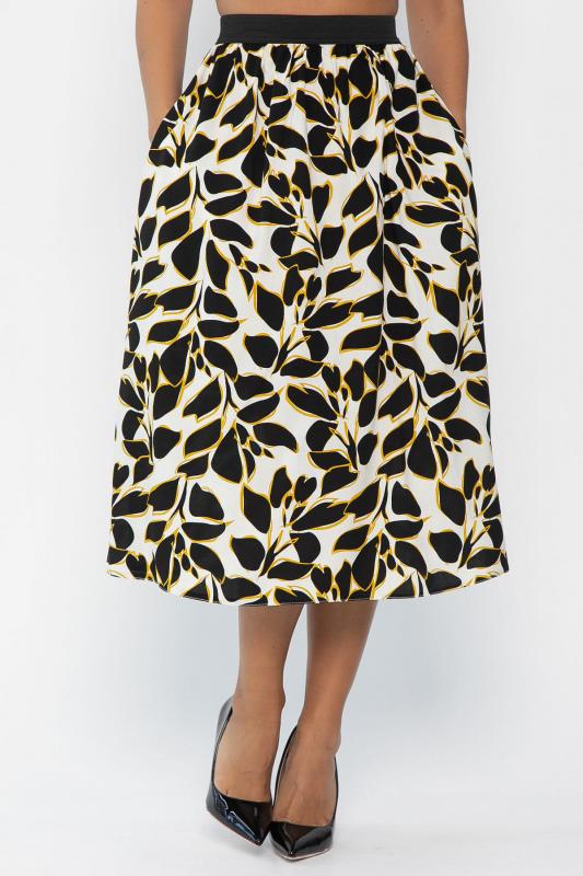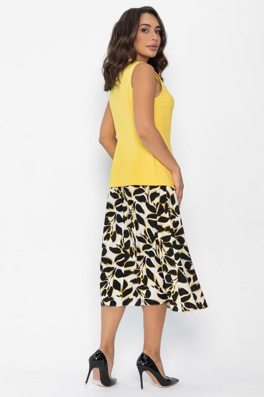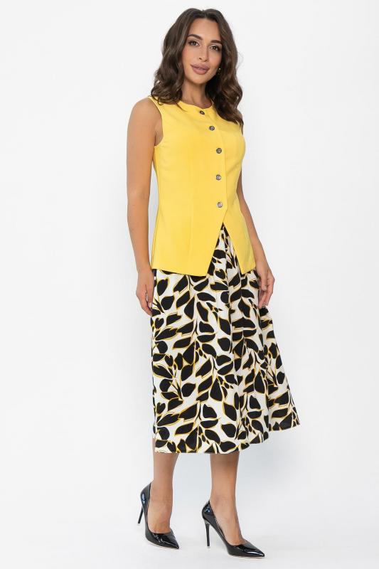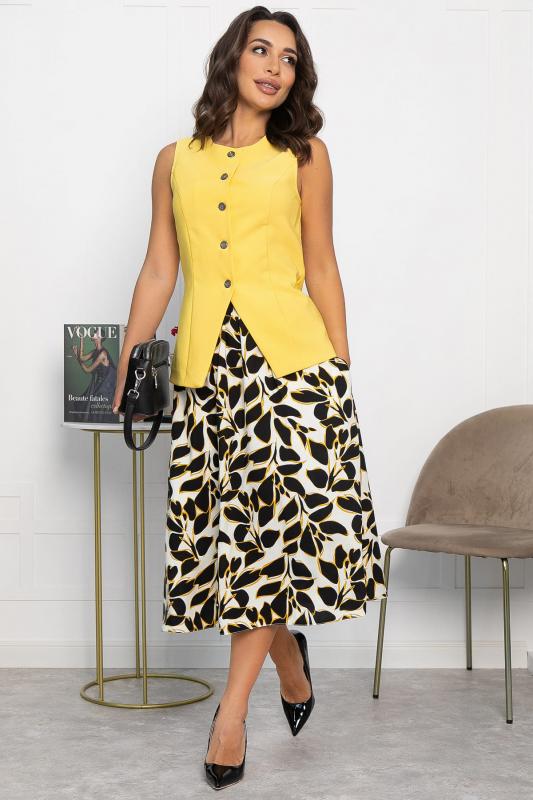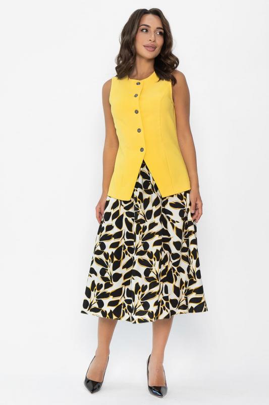 Данный костюм представляет собой оригинальное сочетание женственного и функционального стиля. Составляющие костюма включают: 1. Приталенная модель жилета с классической застежкой на пуговицах, подчеркивающая фигуру. Отсутствие карманов делает внешний вид лаконичнее. 2. Юбка выполнена из штапельного материала с красивым принтом в виде листьев черного цвета с желтыми контурами. Расширяется книзу, что обеспечивает свободу движений и создает плавные линии силуэта. Имеет удобные боковые карманы. Наслаждайтесь элегантностью и красотой, надев этот костюм!