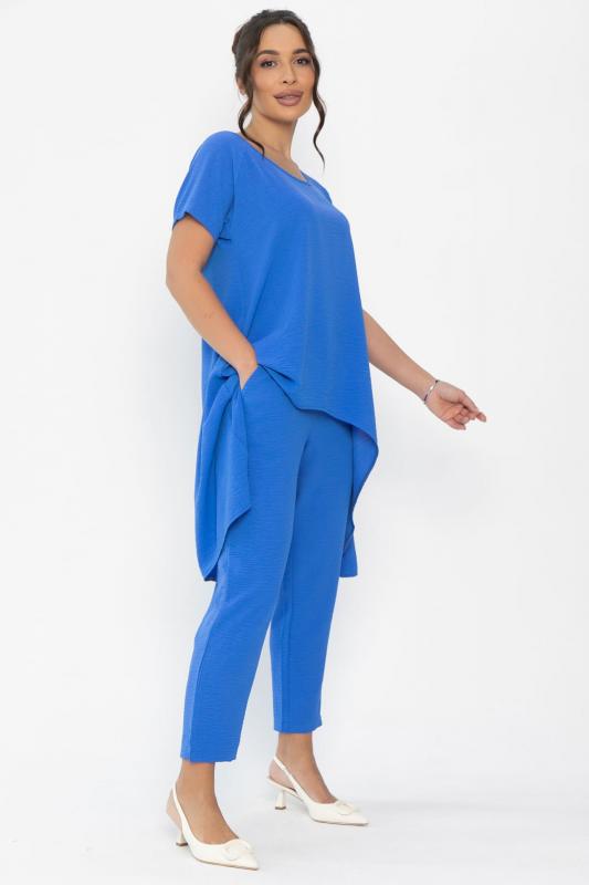 С этим комплектом в оттенке «электрик» вы будете ощущать себя комфортно, независимо от того, где вы находитесь. Необычный фасон придаст свежести вашему летнему гардеробу. Костюм состоит из туники и укороченных брюк! Брюки заужены к низу, по бокам снизу разрезы, карманы в боковых швах, талия на резинке. Туника А-силуэта с асимметричным низом, рукав кроя «реглан».