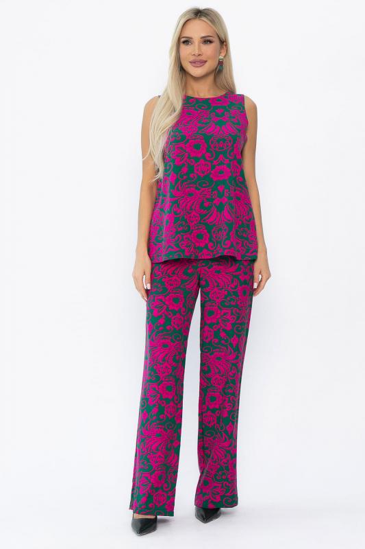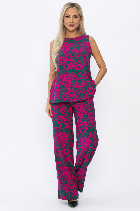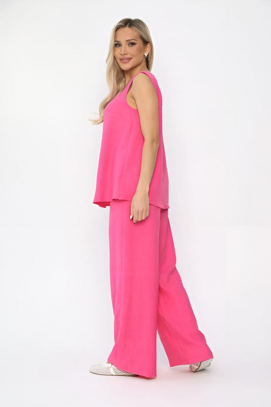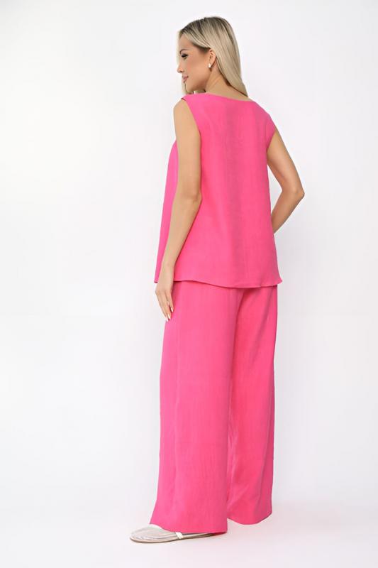 Костюм свободного кроя в оттенке фуксия состоит из легкого топа и просторных брюк-палаццо. Высокая посадка с резинкой в поясе обеспечивает комфорт и удобство. Карманы в боковых швах добавляют практичности и стильности образу. Идеальный вариант для летнего отдыха и повседневных прогулок.