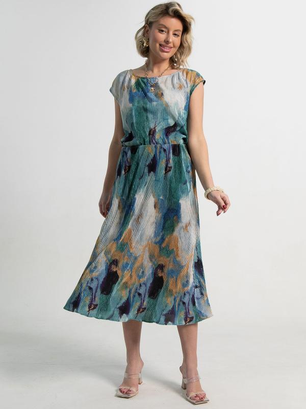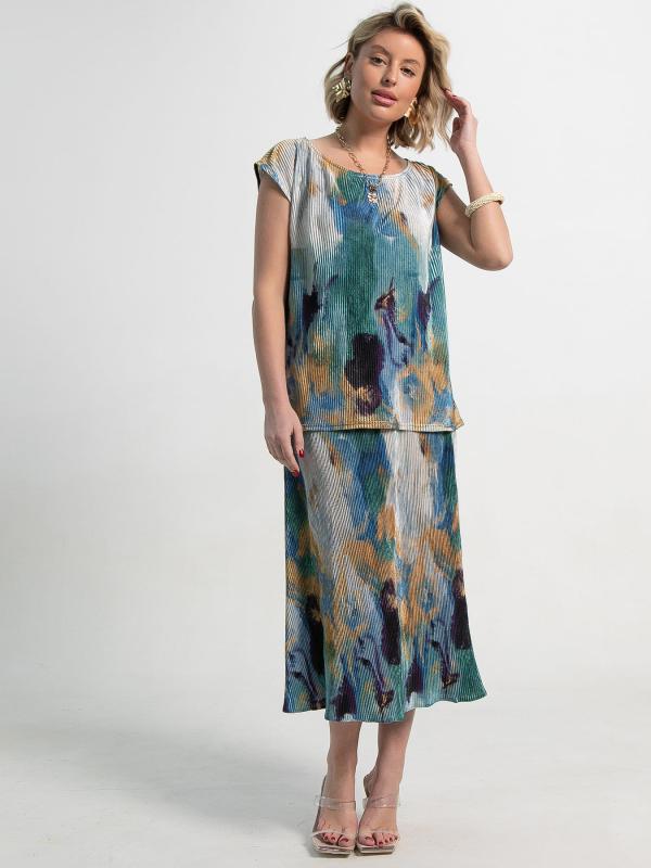 Женский костюм, состоящий из эффектной юбки и стильной блузы. Этот комплект создан для того, чтобы вы чувствовали себя уверенно и привлекательно в любой ситуации. Костюм украшен завораживающим абстрактным принтом, напоминающим художественное полотно. Сочетание глубоких синих, бирюзовых, золотистых и черных оттенков создает ощущение глубины и динамики, делая ваш образ неповторимым. Блуза имеет свободный, но элегантный силуэт с короткими рукавами. Ее свободный крой обеспечивает максимальный комфорт и легкость, позволяя коже дышать. Юбка по талии на резинке прекрасно подчеркивает талию, создавая женственный и гармоничный силуэт. Костюм представляет собой готовое решение для создания стильного образа. Блуза и юбка идеально сочетаются друг с другом, но также могут быть носить по отдельности, открывая новые возможности для создания разнообразных комбинаций.