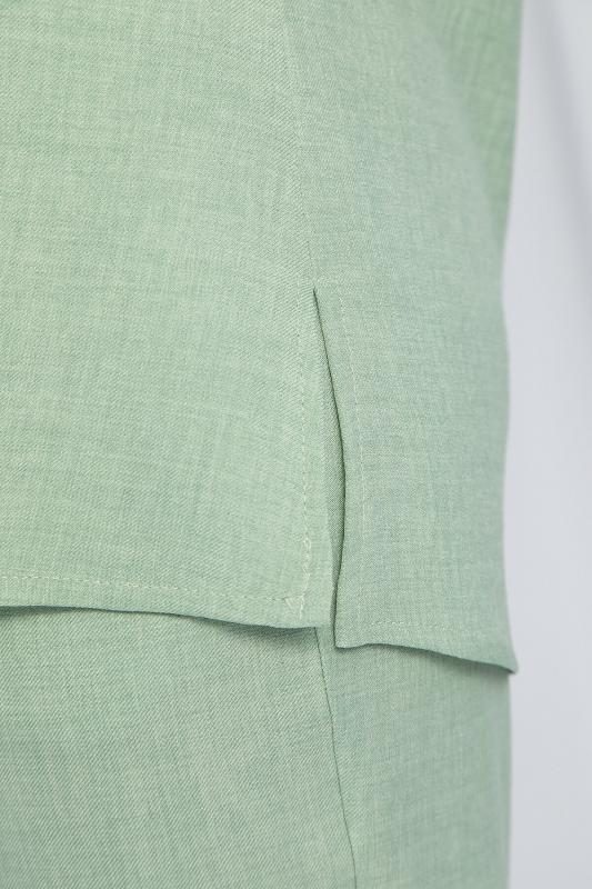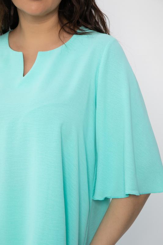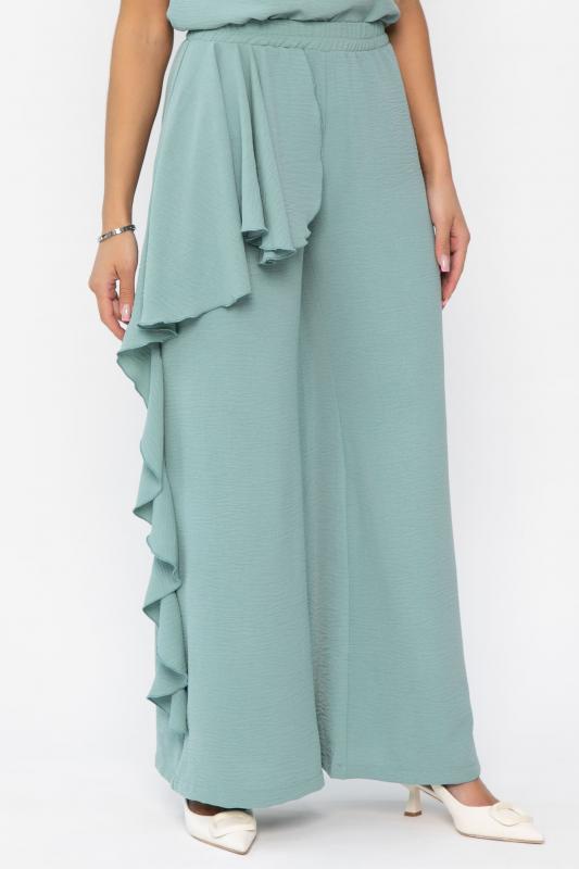 Костюм мятного оттенка универсален: подходит как для повседневных выходов, так и для особых случаев. Брюки прямого кроя, на резинке по талии, с воланом сбоку. Удобный и стильный дизайн идеально подойдет для повседневной носки. Блуза с коротким и цельнокроеным рукавом, идеально дополняет брюки и создает завершенный образ. Легкая и комфортная ткань обеспечит вам комфорт в течение дня.