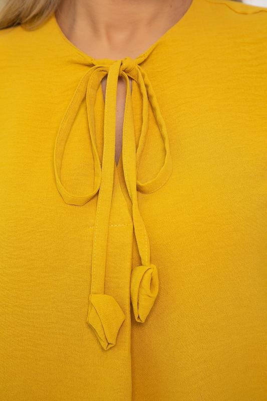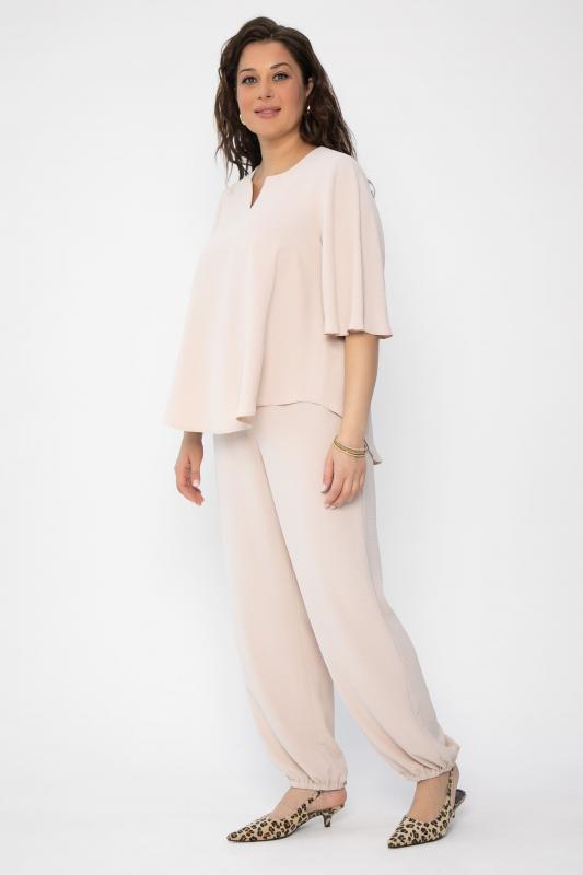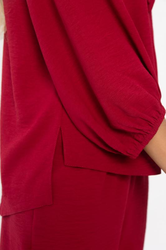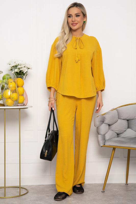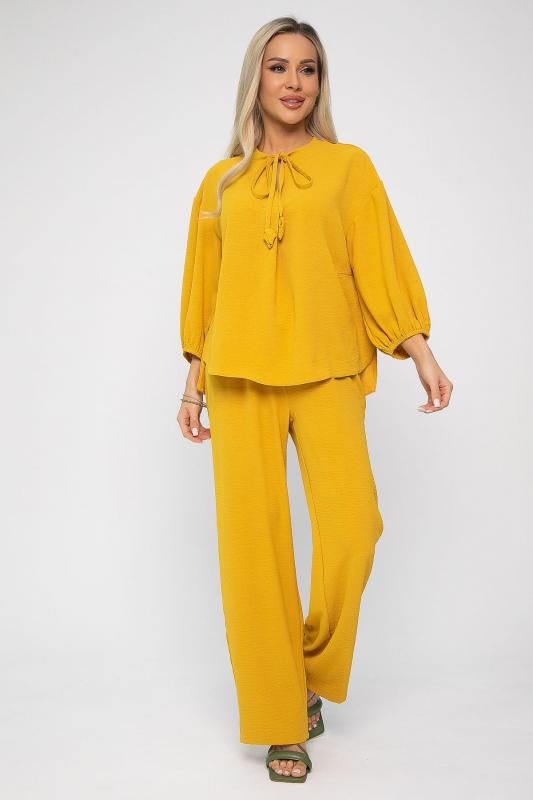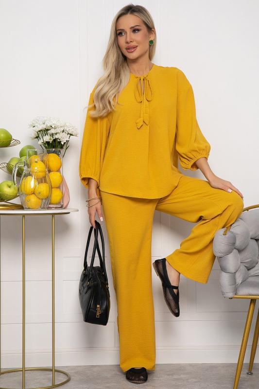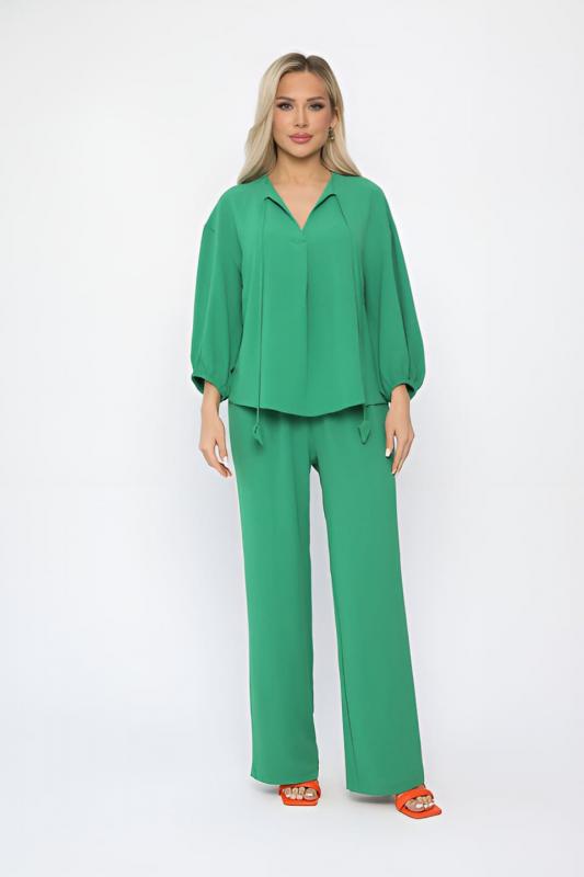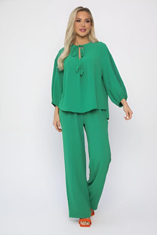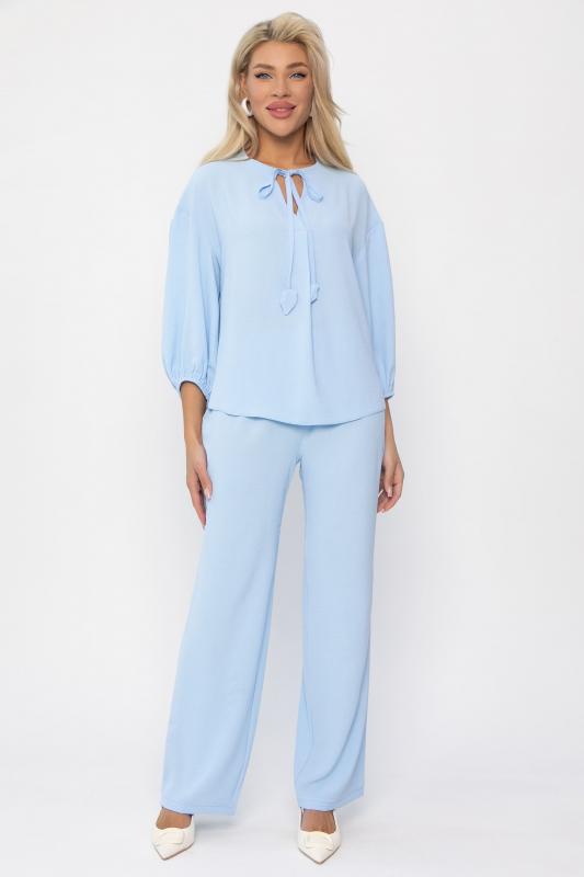 Женский костюм из жатой ткани. Блузка свободного силуэта с ассиметричным низом. Рукава 3-4 оформлены по низу на резиночке. Вырез горловины по переду блузки V-образной формы со складкой. Также оформлен завязками с декоративными элементами на концах. Брюки прямого кроя. Пояс на резинке подчеркивает талию и создает идеальную посадку, благодаря чему вы будете чувствовать себя уютно и уверенно. Этот костюм идеально подходит как для повседневных выходов, так и для более торжественных мероприятий.